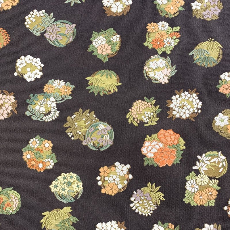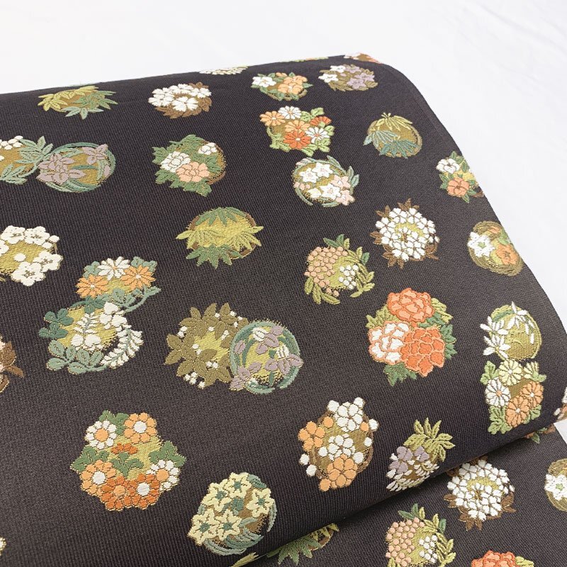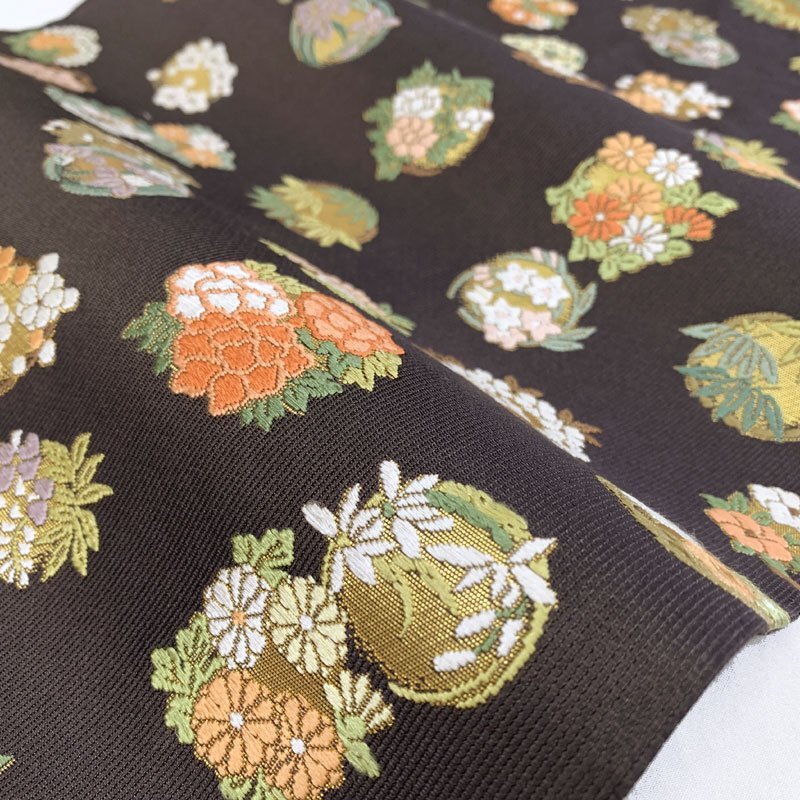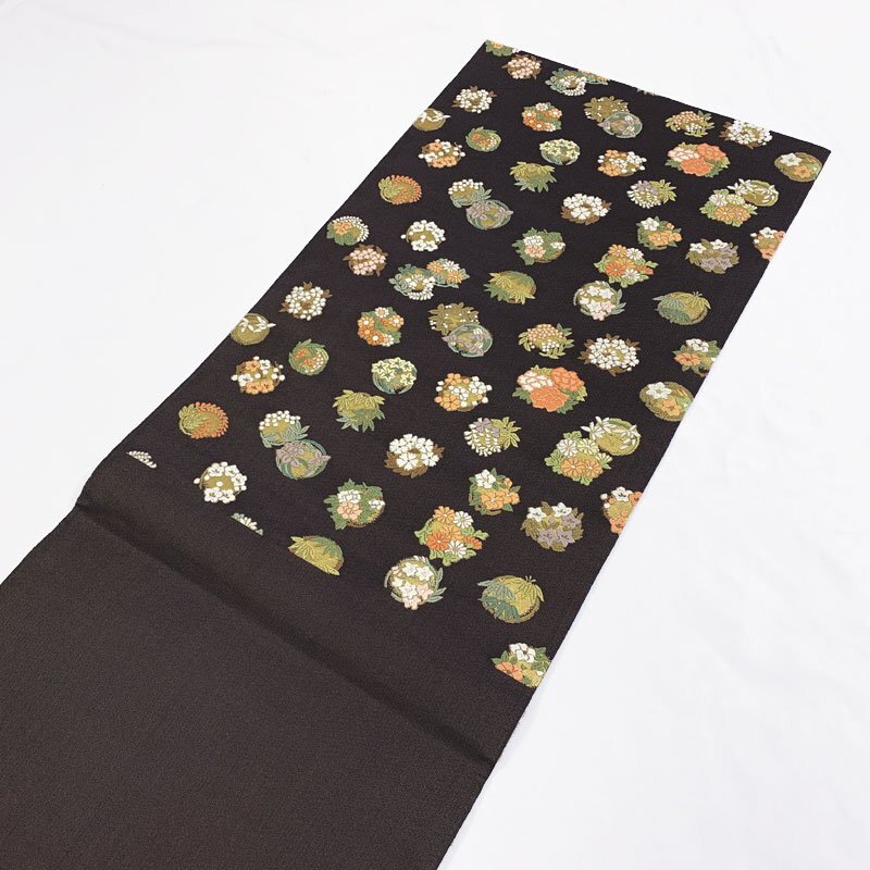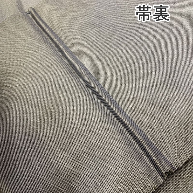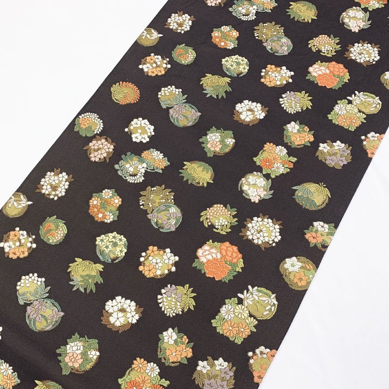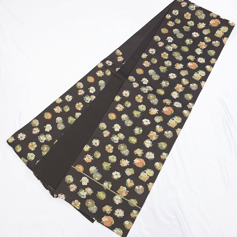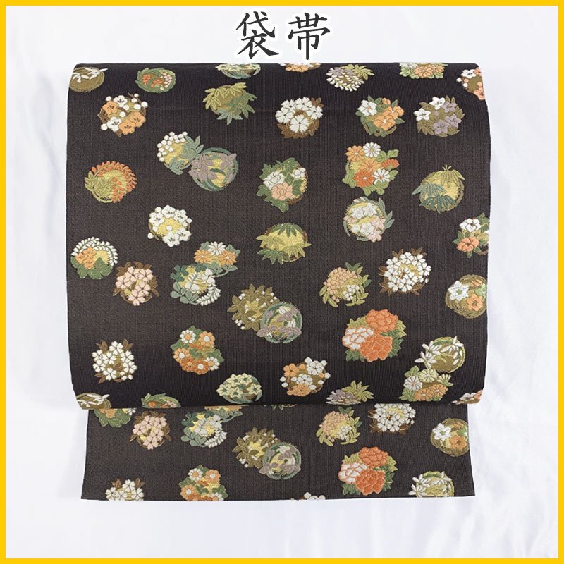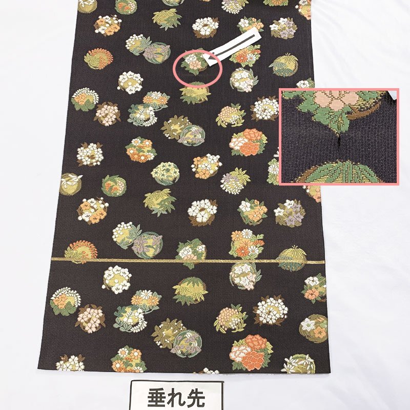 | ◇四季花 花丸文 唐織 金糸 六通 袋帯◇美品 (No.hd) わずかに黄色みを帯びた濃いグレーの地に桜や菊、梅に松、藤など季節の花々が可愛らしく花丸文に織り出された六通の袋帯です。 垂れ先から36cmあたり、帯前(柄どまりから22cm)のどちらも帯幅中央あたりに糸が寄ってしまっている箇所がございます。垂れ先付近は見えなくなる箇所、帯前も帯幅や巻く向きで見えなくなる箇所ですのでどうかご了承ください。帯のちょうど中央の帯裏、保管の際のたたみ線が強くついています。見えない箇所ですが、気になる方はプレスをおすすめします。その他、締め跡や軽微な糸の浮きはございますが、目立つようなシミ・ダメージもなく美品です。 【素材】正絹 【色】わずかに黄色みを帯びた濃いグレー・金・多色 *モニターによって色味は実際と異なる場合がございます。 【サイズ】幅:31.3cm、長さ:442cm *素人採寸のため、多少の誤差はご容赦ください。 上質な逸品ですので、いかがでしょうか?よいお品物でお勧めです^^ | |
