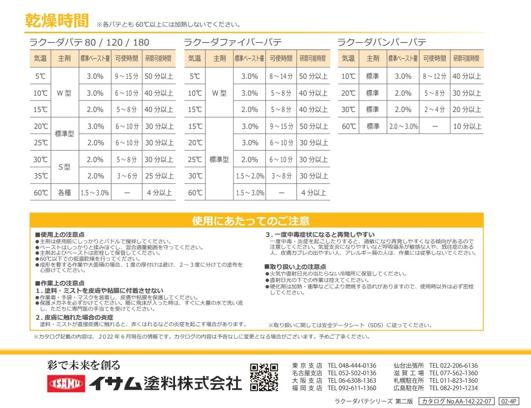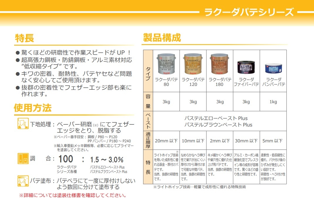 【内容量】主剤 3kg + 硬化剤 80g ◆研磨可能時間 : 30分以上(20℃) ラクーダパテの遺伝子を受け継いでおり、研磨性はもちろん、ファイバーパテに必要な盛り性・成形性に優れたファイバーパテです。 ラクーダパテシリーズ 驚くほどによく研げる!! “ 研磨性の追求 ”= スピードUP ★特長 1.驚くほどの盛り性と研磨性です。 2.アルミ・カーボン繊維強化型の低収縮鈑金パテです。(高張力鋼板対応) 3.垂れにくく、ヘラ離れが良いので、プレスライン等の成形が容易に行えます。 4.国産車、輸入車問わず、防錆鋼板、アルミパネル、FRPパーツへの密着が良好です。 5.耐熱密着性に優れています。 6.成形後の即加熱(60℃×4分)が可能でエネルギーコスト50%削減、省エネにつながります。 |