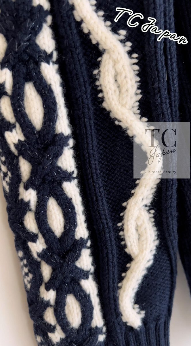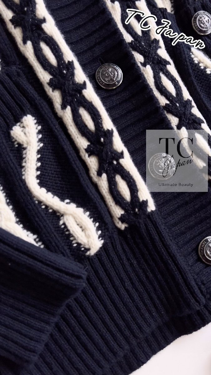 シャネル カーディガン CHANEL ネイビー アイボリー ウール カシミア ケーブル ニット ふんわり 女優 人気 超美品 36 38