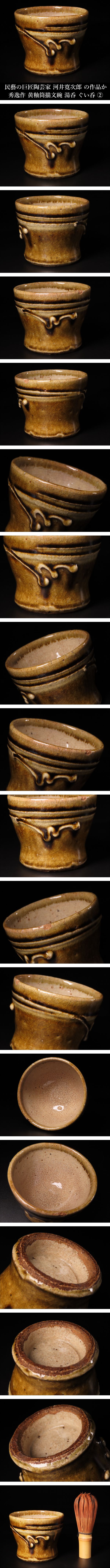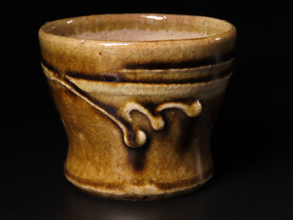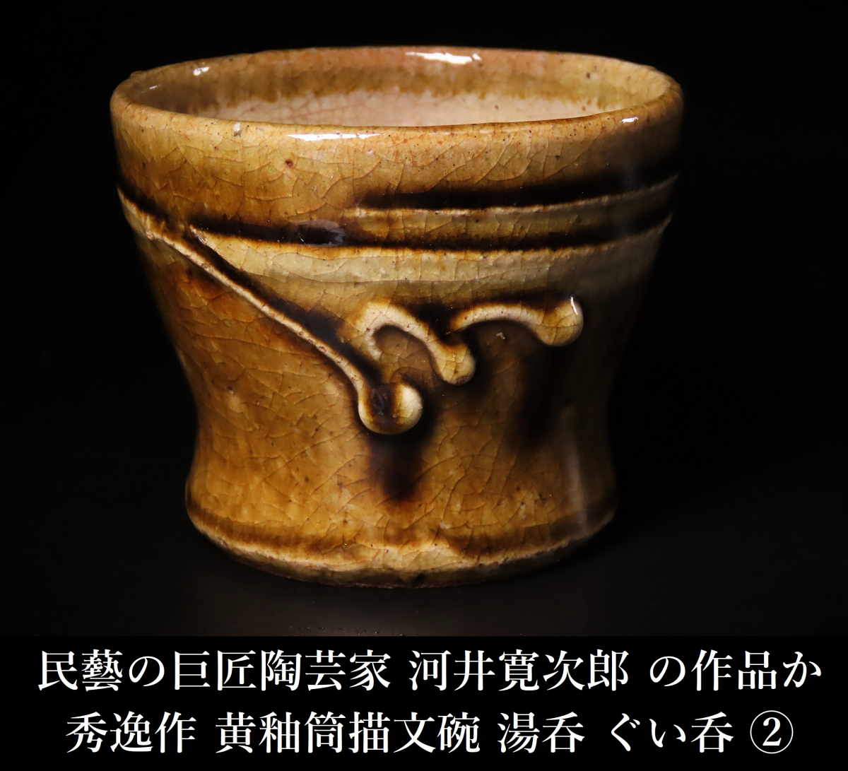 【ONE'S】民藝の巨匠陶芸家 河井寛次郎 の作品か 秀逸作 黄釉筒描文碗 湯呑 ぐい呑み 煎茶碗 茶器 茶道具 古美術品 ② | |||