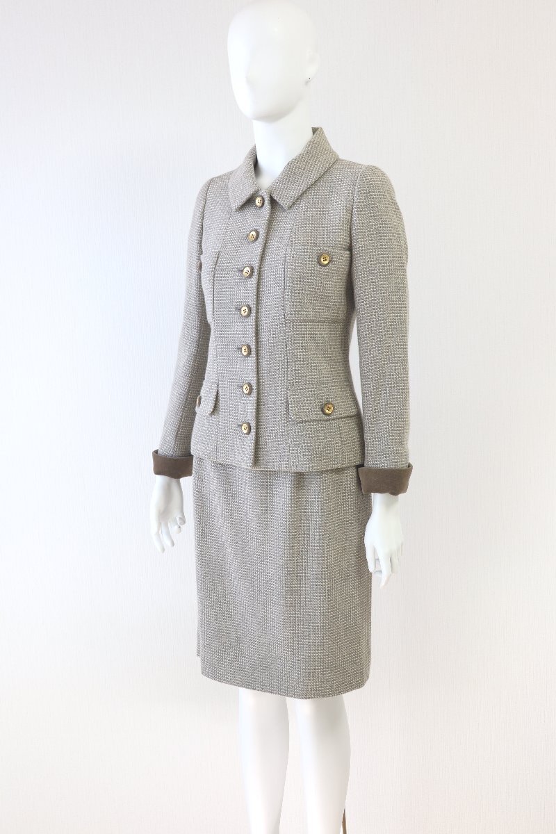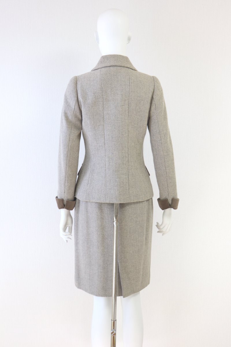 コメント ルネブティックの商品です。グレー×ベージュのグレージュ系ウール生地のジャケットとスカートのスーツです