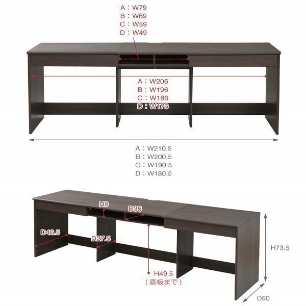 | 【カラー】 ブラウン 【サイズ】 <外寸> (A)幅210.5×奥行50×高さ73.5cm (B)幅200.5×奥行50×高さ73.5cm (C)幅190.5×奥行50×高さ73.5cm (D)幅180.5×奥行50×高さ73.5cm <内寸> オープン部:幅(A)79 (B)69 (C)59 (D)49×奥行36×高さ9cm 脚部:幅(A)206 (B)196 (C)186 (D)176×奥行46.5×高さ49.5cm 引き出し:幅58.5×奥行33.5×高さ6.5(有効内寸7.5)cm 【材質】 本体:合成樹脂化粧合板(PVC) 【耐荷重】 天板中央:40kg以下 天板両サイド:各15kg以下 引き出し:各7kg以下 オープン部:10kg以下 【生産国】 中国 【梱包】3梱包でお届けします。 3-1 サイズ:82×54×12cm、重量:16.8kg 3-2 サイズ:82×52.5×9.2cm、重量:9.8kg 3-3 サイズ:(A)94×54.5×11cm (B)87.5×53.5×11cm (C)78.5×54×10cm (D)71×54×10.5cm 重量:(A)17.2kg (B)15.6kg (C)14.2kg (D)13kg 【その他】 背面化粧有り 【組み立て品】 お客様による組み立てが必要です。 【ご注意】 ・サイズ、重量は概算です。 ・商品カラーはご使用のモニターによって実際の明るさや色と異なって見える場合がございます。 |