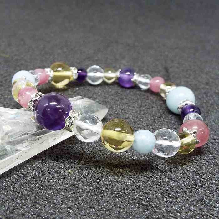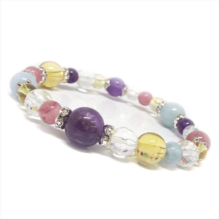 | 【STONE KITCHEN天然石パワーストーン】 ☆幸せへと導いてくれるパワーストーンを繋いで素敵なブレスレットが出来ました☆ アメジスト・・・ 愛の守護石として大切な人との心の絆を深め 真実の愛を守り抜く強さをはぐくむとされます。 アクアマリン・・・ ネガティブなエネルギーを解放し クリアな思考と調和を取り戻す手助けをしてくれるといわれています。 シトリン・・・ 黄金色の輝きを持ったシトリンは金運アップに効果があるとされています。 関わる人々の心を暖かく豊かに 導いたり町や家族を更なる繁栄へと引き上げるといわれています。 ストロベリークォーツ・・・ 前向きに勇気を出すことができ 期待する気持ちを生み愛情を呼び込むパワーがあるといわれています。 内周:約16cm 玉サイズ:アメジスト 約10mm・約8mm・約6mm ストロベリークォーツ 約8mm・約6mm カット水晶 約8mm・約6mm シトリン 約10mm・約8mm・約6mm アクアマリン 約10mm・約8mm・約6mm 1点 注意事項 ※金属部分は汗や汚れ等で変色する場合がございます。気になる場合は金属磨きや布等で軽くふき取る事をおすすめします。 ※石の種類によっては、艶を引き出すことを目的として、ワックスや着色加工がされているものもあります。 ※表示のサイズは必ずしも最大値・最小値のサイズのものが入っているわけではございません。 ※天然石のため同じものでも色味・模様などが異なります。 ※照明の具合で実際とは色合いが異なる場合がございます。 また、天然素材特有のクラック・内包物を有する場合がございます。予めご了承下さい。 | ||
