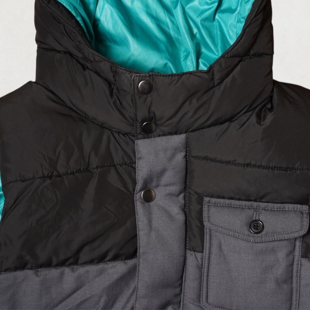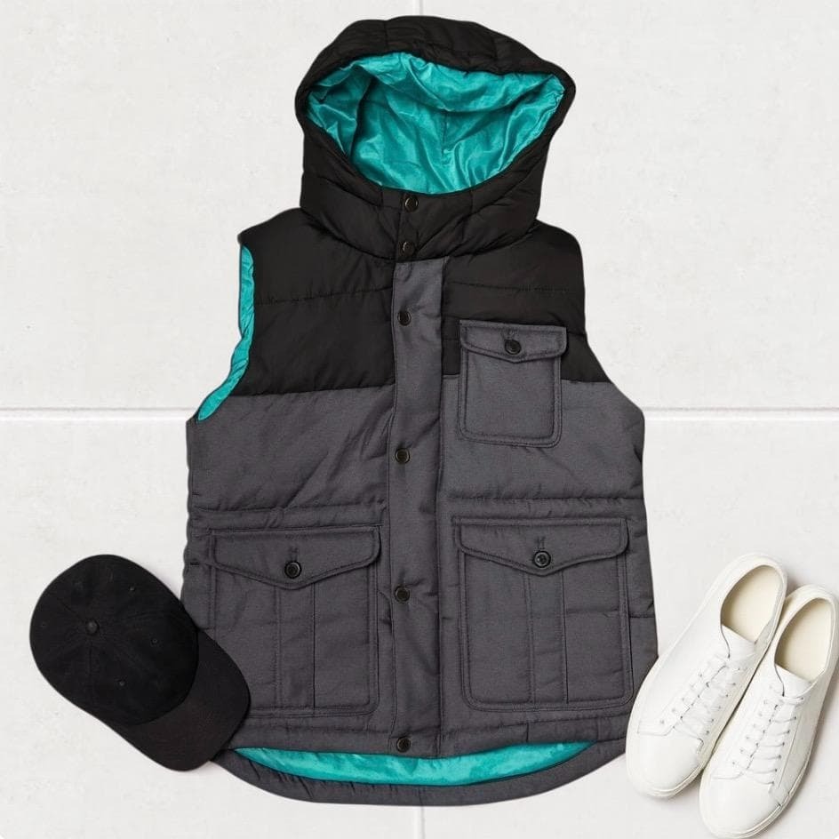 グレー×ブラックの配色がスタイリッシュな中綿ベストです。