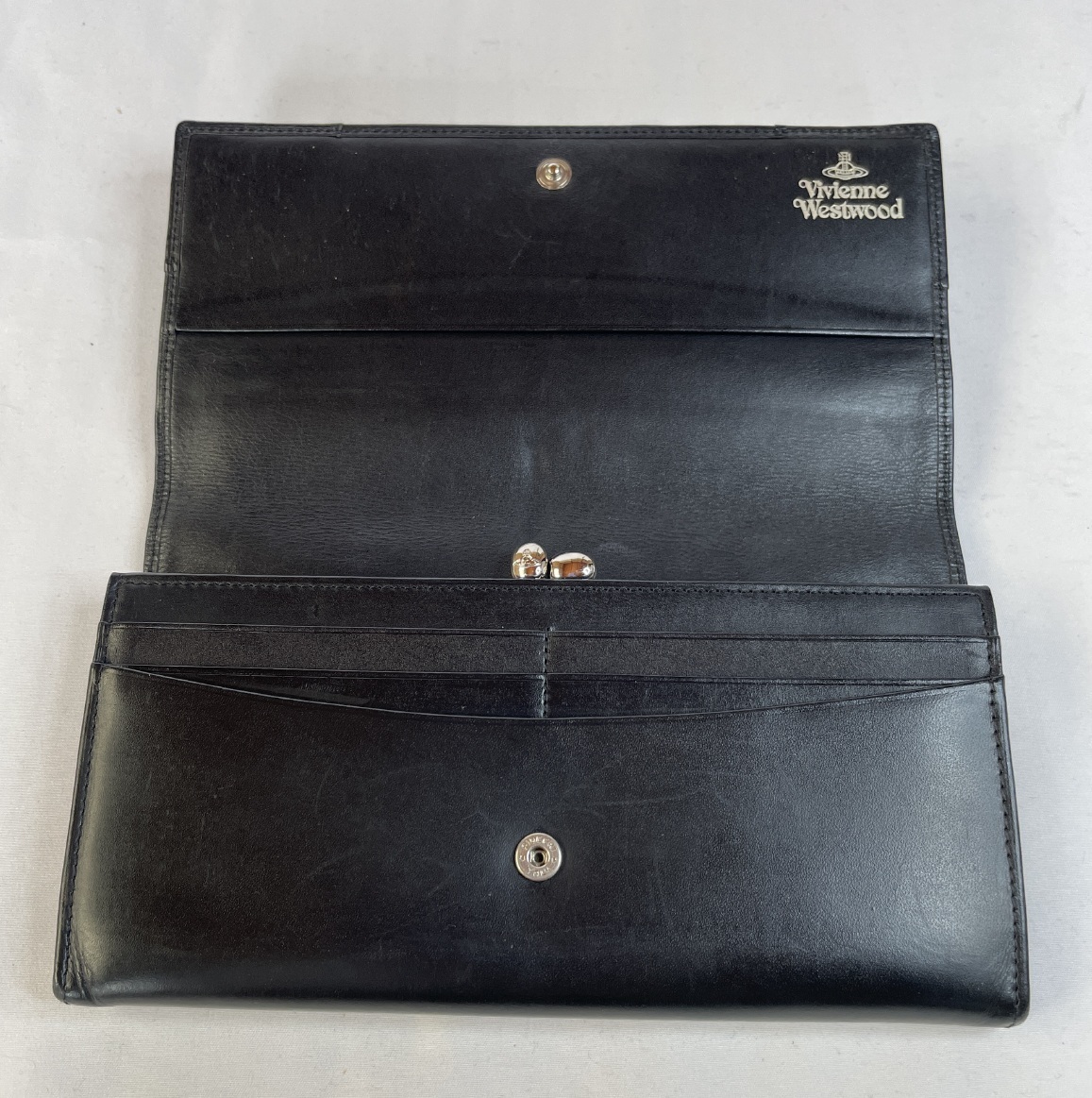 ◆ブランド◆ VivienneWestwood(ヴィヴィアンウエストウッド) ◆デザイン◆ シンプルで上品な印象を与えるブラックレザーの長財布です。フロント中央にはヴィヴィアンウエストウッドを象徴するオーブのメタルロゴがあしらわれており、ブランドらしい個性と高級感を演出しています。全体的に無駄のない洗練されたデザインで、ビジネスシーンからカジュアルまで幅広くお使いいただけます。滑らかなレザーの質感と、さりげないステッチのディテールが上品さを引き立てる一品です。 ◆サイズ◆ [タ テ]10.7㎝ [ヨ コ]19㎝ [厚 み]2.8㎝ [コインポケット]1 [ポケット大]2 [ポケット中]2 [カードポケット]16 ※素人採寸のため、若干の誤差はご容赦ください。 ◆カラー◆ ブラック ◆素 材◆ レザー ◆状 態◆ コンディションC ※軽微なメンテナンス(レザー部分の補色・オイルアップ、キャンバス部分のクリーニング、金具磨き)を施しており、「綺麗な状態」です。 【A】未使用/新品 【B】数回の着用しかしておらず、ほぼ未使用に近い。 【C】若干の使用感はあるが、状態は良い。 【D】使用感と部分的に目立つダメージや汚れあり。 【E】過度の使用感、目立つダメージや汚れあり。 その他注意 ※あくまでも中古品ですのでご理解頂ける方のみご購入お願いします。 ※撮影カメラの性質上、実際の色調と若干異なる場合がありますのでご了承下さい。
