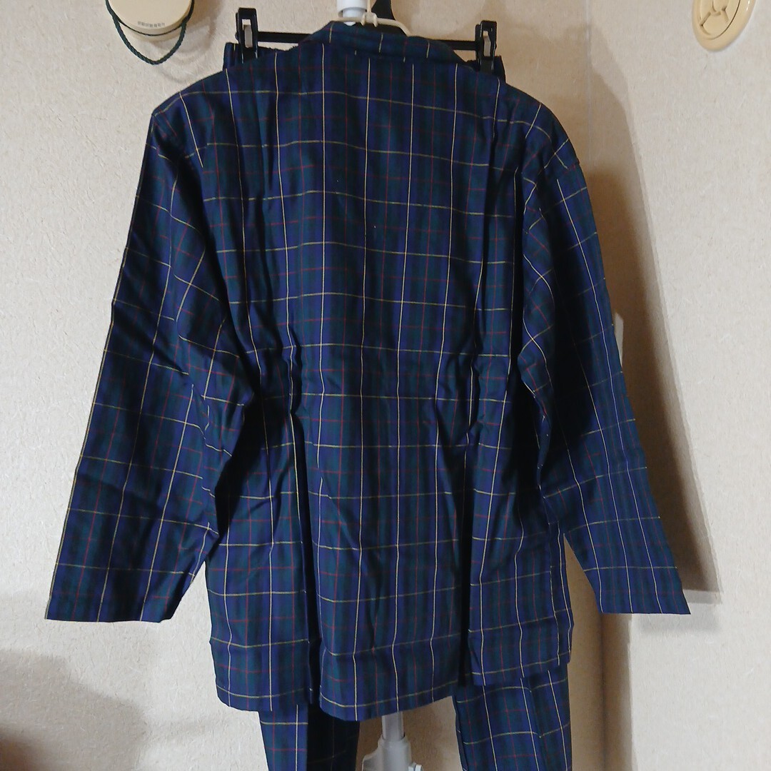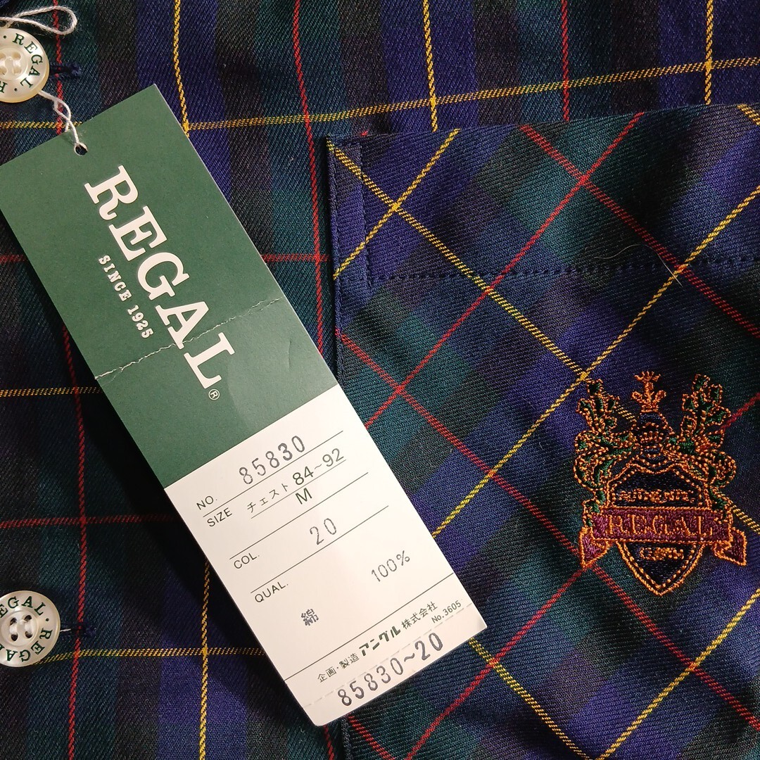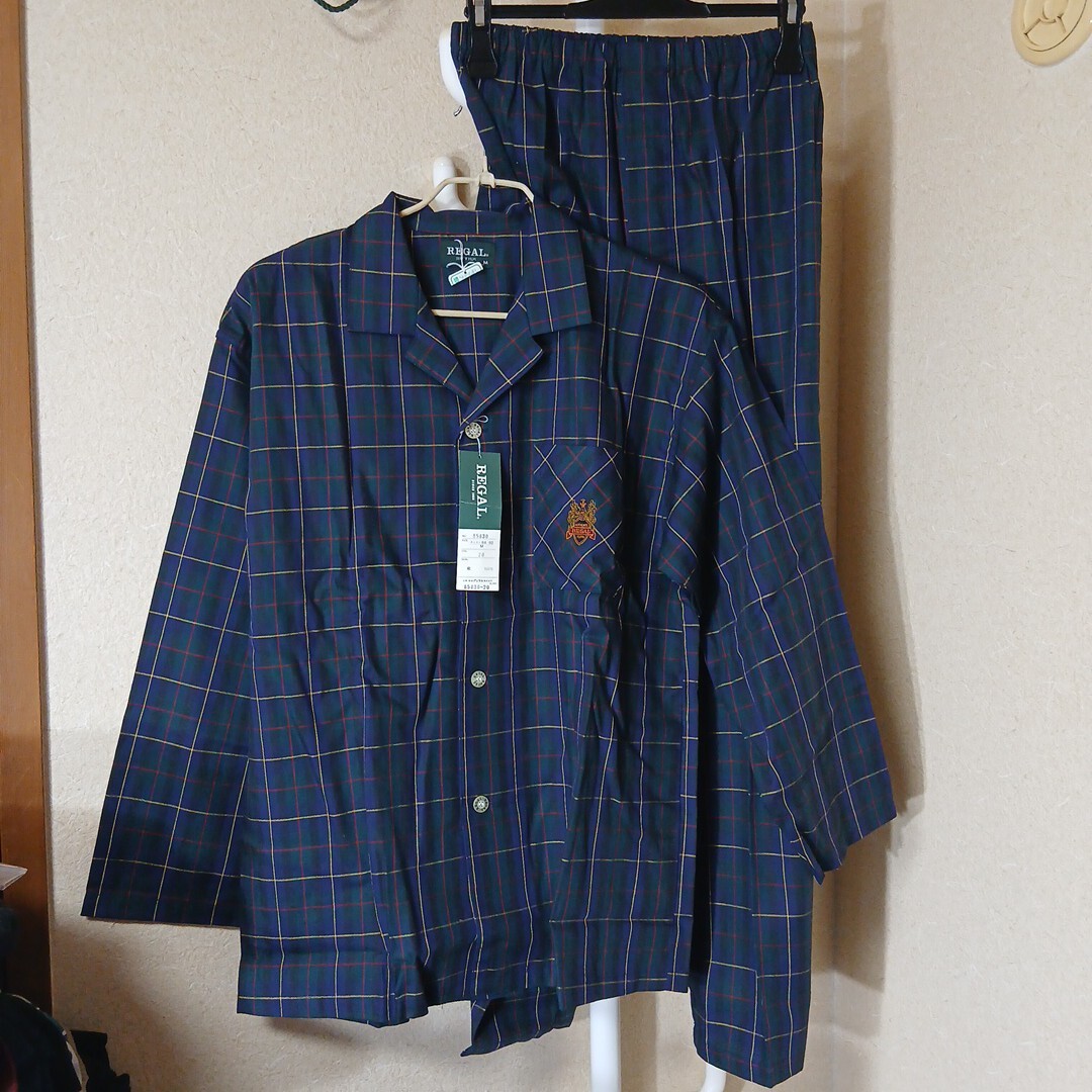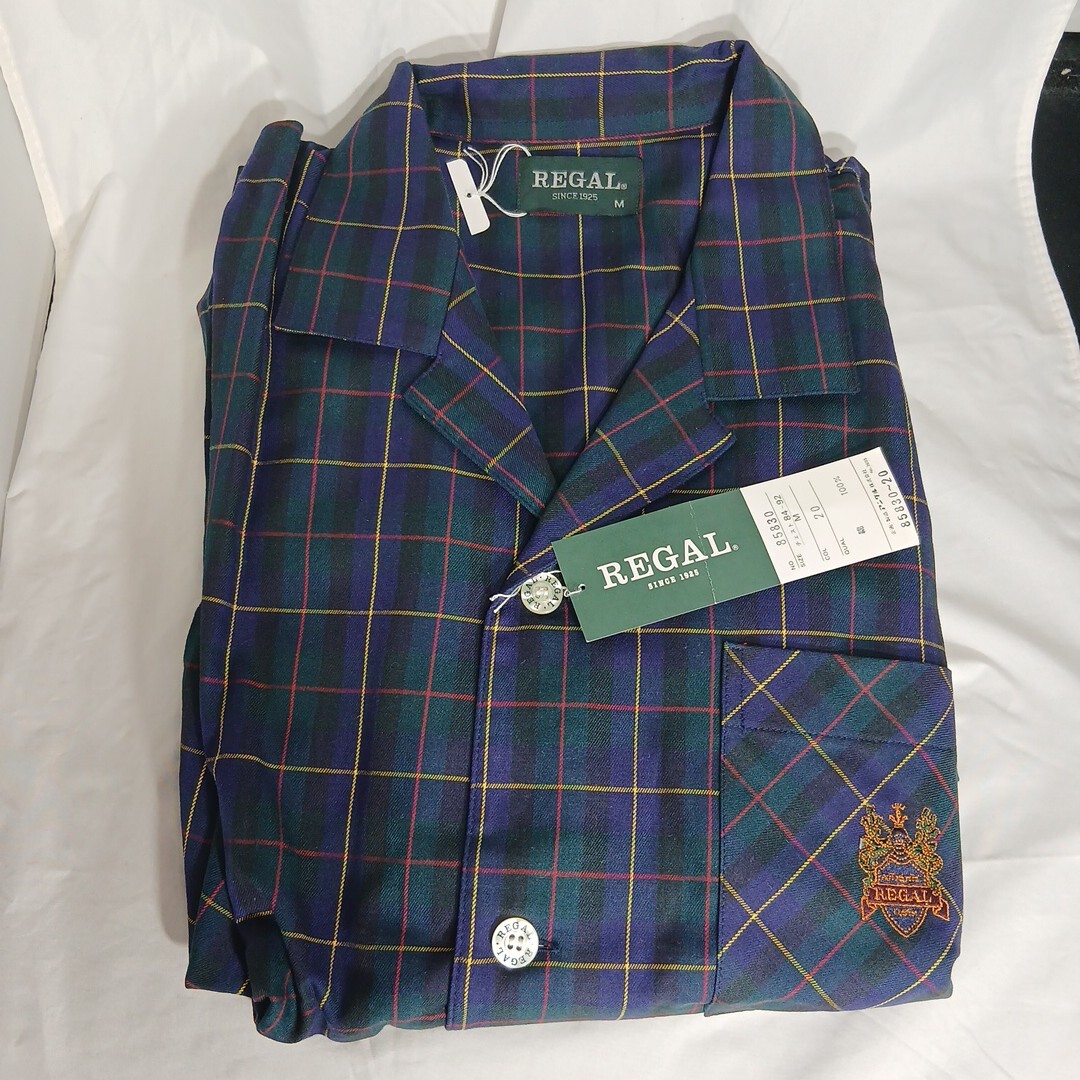リーガル(アングル)のパジャマです。サイズはMで、チェスト84~92センチです。素材は、綿100%です。長袖で長ズボンで前開きです。未使用ですが自宅保管品です。