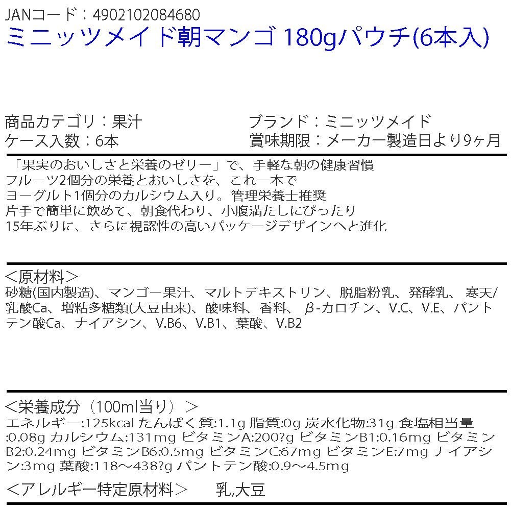 | 商品名 | ミニッツメイド朝マンゴ 180gパウチ(6本入) | |