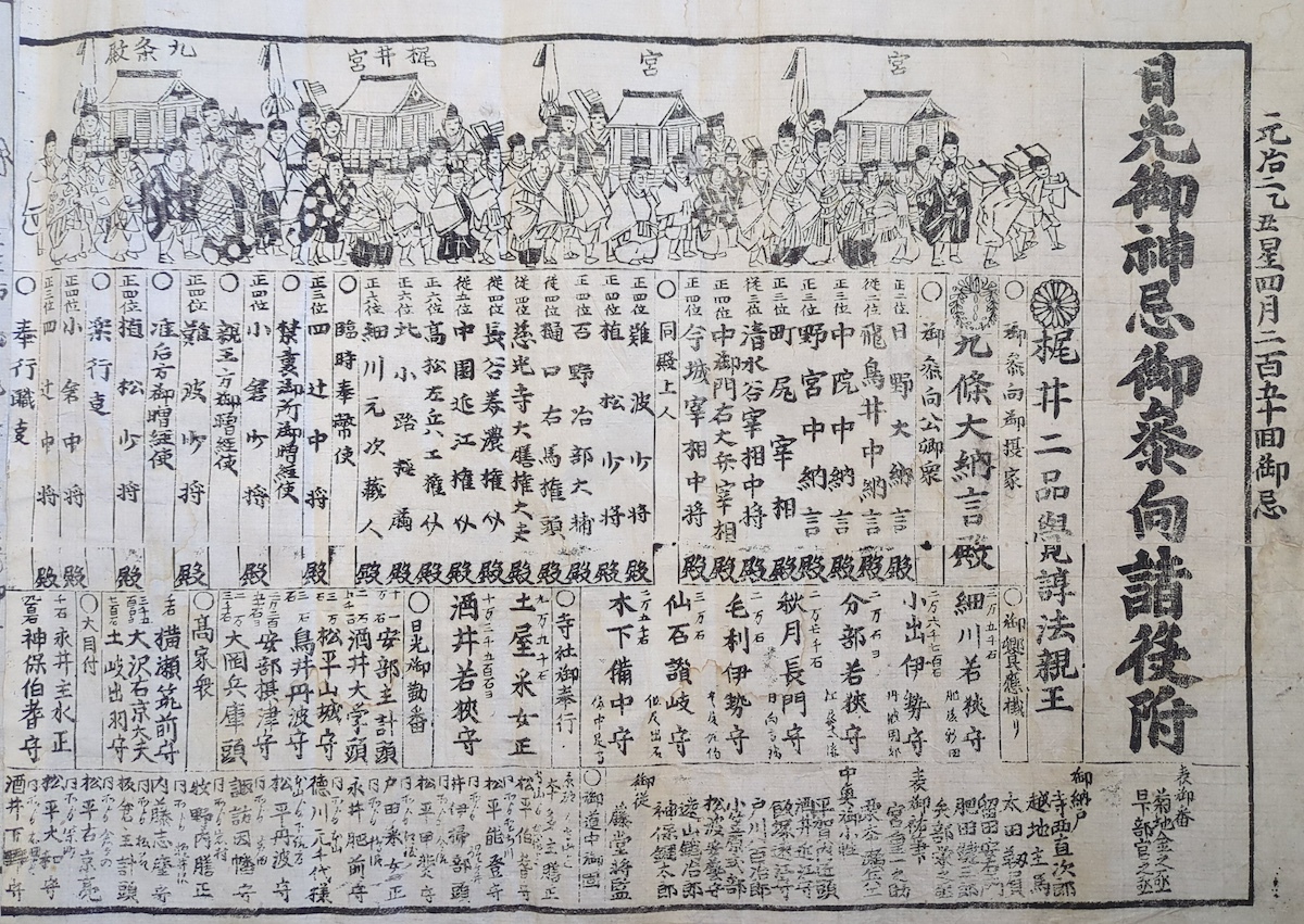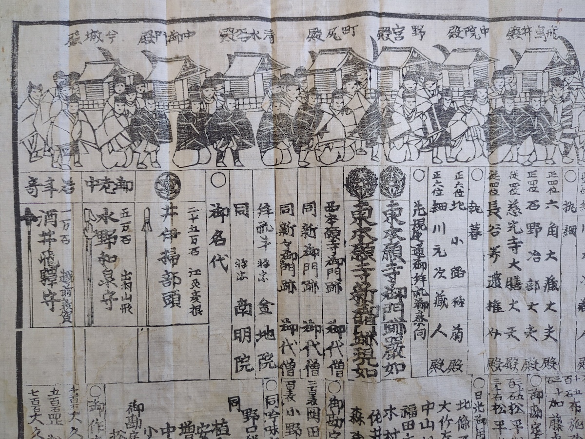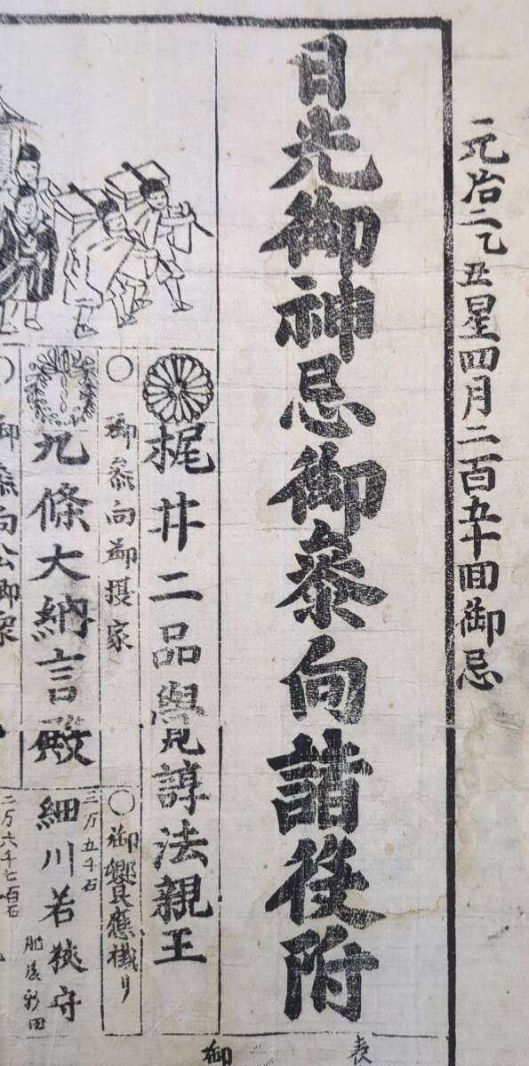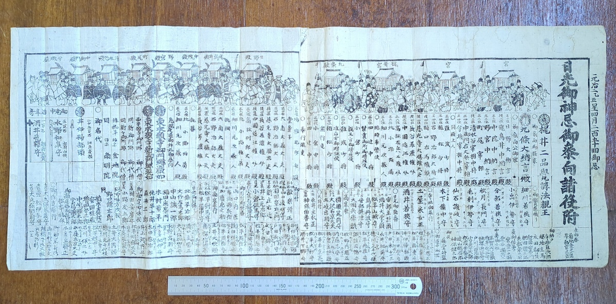 日光御神忌御泰向諸役附 武鑑 大名行列 江戸期 木版画 刷物 絵入 旗印 大名 武家名入 大判かわら板 新聞 和本 浮世絵 錦絵 古地図 鳥瞰図