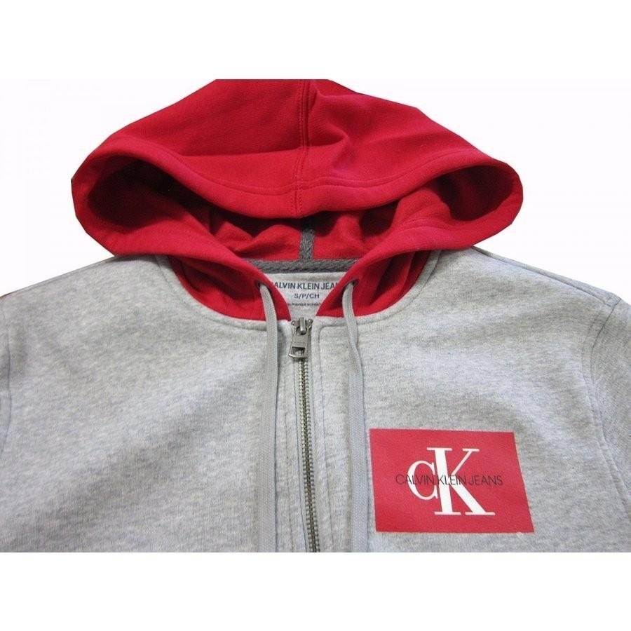 CALVIN KLEIN JEANS カルバンクライン ジーンズ メンズパーカー ジップフード ジップパーカ フーディー 41K7393 グレー/レッド(S)です。 ■素材 コットン72% ポリエステル28% ■サイズ 身幅(約51cm)X肩幅(約43cm)X着丈(約63cm)X袖丈(約63cm) ■特徴 身頃がグレーでフードがレッド 左胸部分にCALVIN KLEIN JEANSロゴ9.5cmX6.5cmのプリント | ||||||