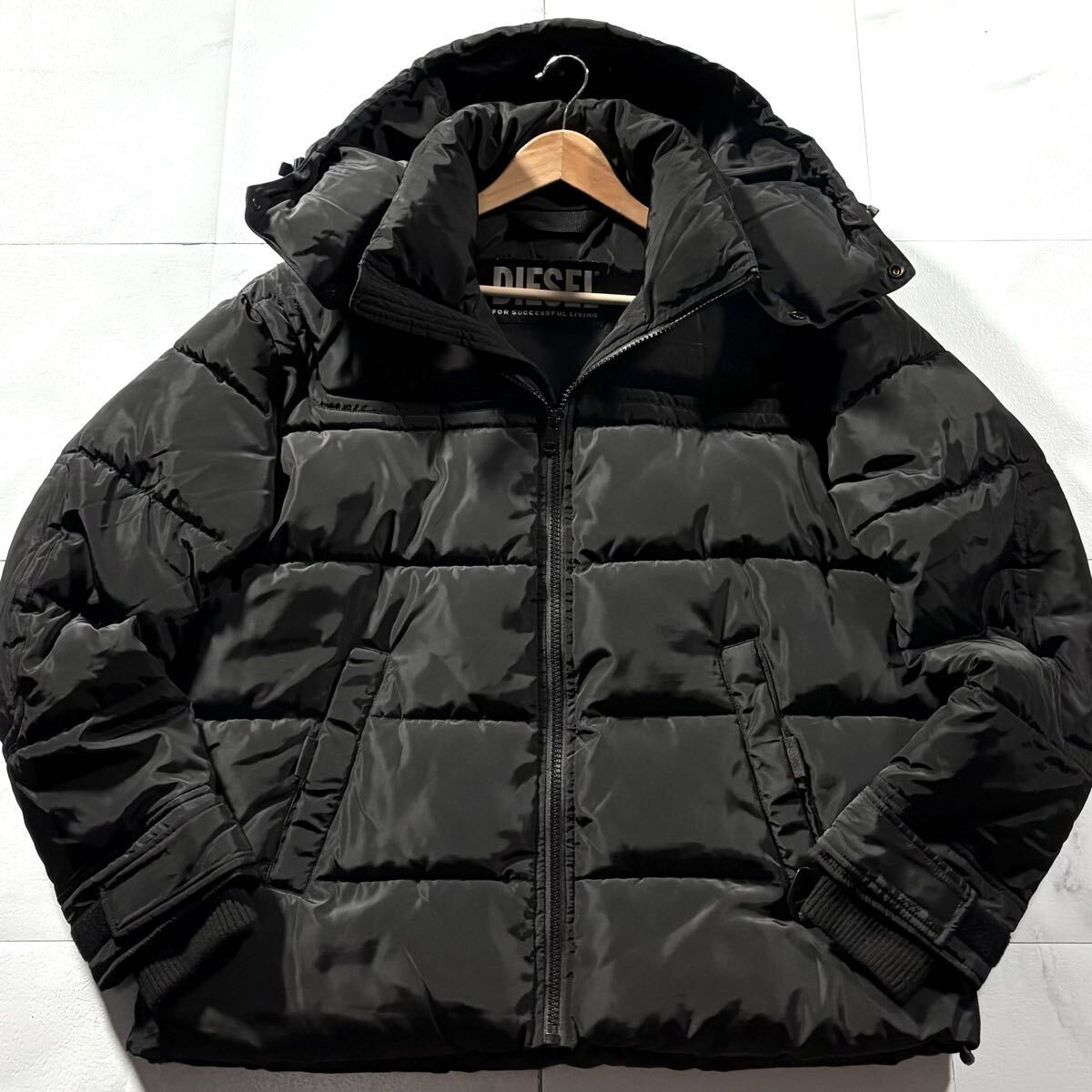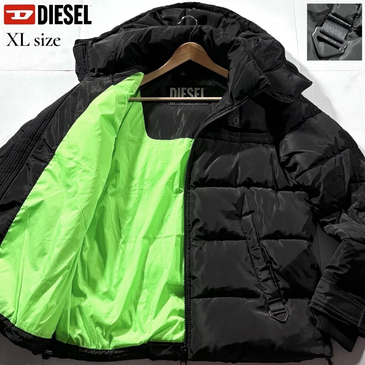 極美品/XLサイズ相当●現行タグ DIESEL ディーゼル エコ ダウンジャケット 中綿 アウター ロゴ金具 裏地グリーン 背面ロゴ 洗濯可能◎ 黒
