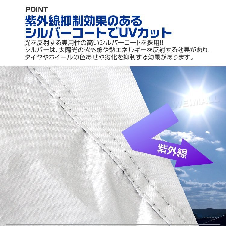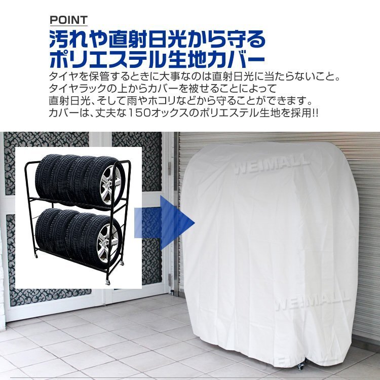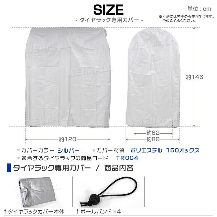 | タイヤラック専用のカバーです。 カバーは丈夫な150オックスのポリエステル生地! 雨・雪、ほこり等からラックごとタイヤを守ります 光を反射する実用性の高いシルバーコートを採用! |