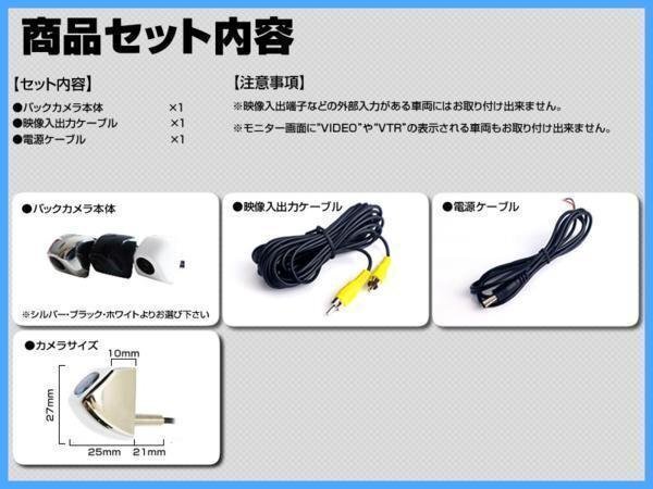 | ・バックカメラ本体 × 1 ・電源・映像ケーブル × 1 ・固定用両面テープ × 1 ・固定用ナット × 1 |