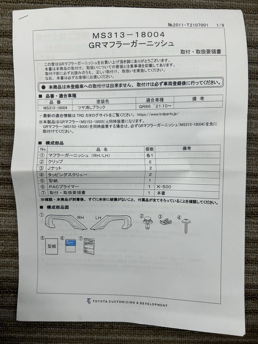 2023年式 GR86 RZ 10th Anniversary Limited (ZN8)から外しました。、トヨタ純正オプション GR マフラーガーニッシュ 左右SETです。本体のみです。取説あります。両面テープを張りなおしてお使いください。当方GR86乗り換えに伴い、GR86パーツ各種出品予定です。よろしくお願いします。