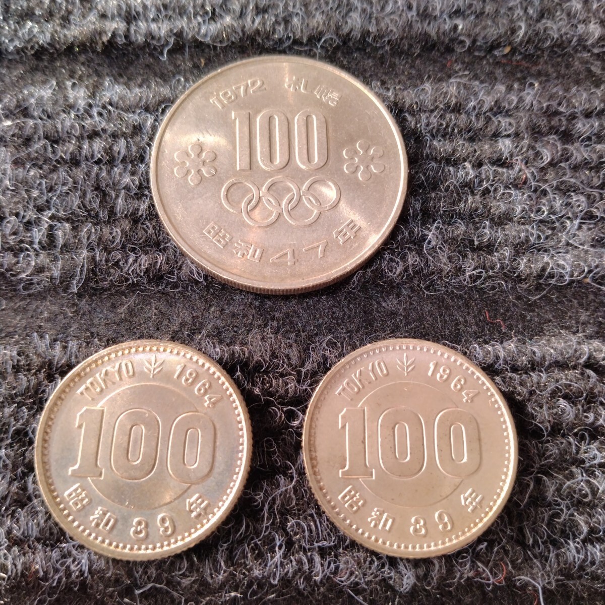 東京オリンピック記念昭和39年100円銀貨2枚、札幌オリンピック記念昭和47年100円白銅貨1枚の出品です。 商品の画像は撮影環境(蛍光灯)とパソコン環境によって、見え方が違う場合がありますので、予めご了承ください。 長期保管品、中古品であることをご理解頂き、ご入札下さいますようお願いいたします。イメージの違いなど主観的な理由での交換・返品は出来ませんので、慎重にご検討いただいた上でご入札下さい。