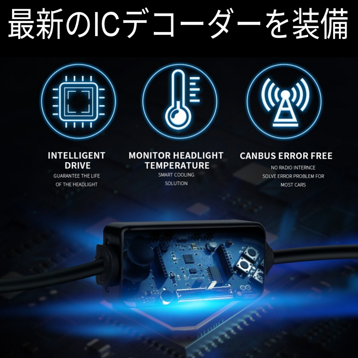 本製品はCSP3570チップを採用した高性能LEDヘッドライトです。従来主流のCOBやZESを上回る高効率設計で、各バルブに12個の高輝度チップを搭載しています。