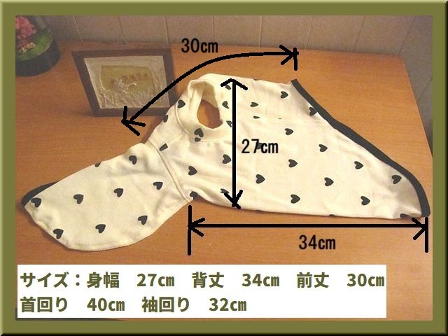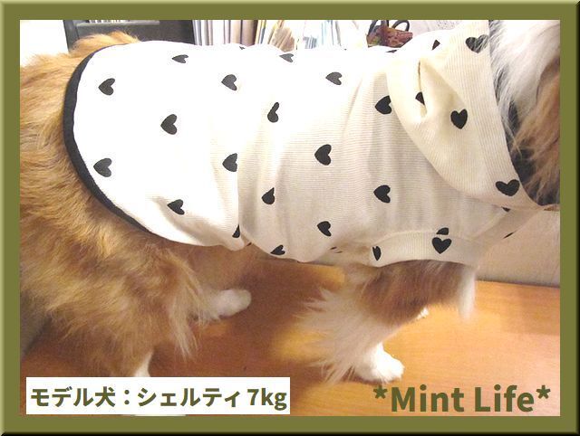 | *商品詳細* 商品名: *Mint Life* ハンドメイド 「中型犬ドッグウェアー」Lサイズ 6~8kg 使用生地: バニラ色のニット生地(ポリエステル100% )に黒のハート印刷 サイズ: L寸 (6~8kg適用) 背丈 34㎝ / 前丈 30㎝ /身幅 27㎝ 首回り 40㎝ / 袖回り 32㎝ 重さ: 約54g (梱包前) (採寸の誤差はご了承ください。) *形の説明* フード付きのドッグウェアーで、ニット生地のため、かぶるシャツ型です。 フード周りと裾周りはニットテープで巻いています。 生地の厚みは薄いので、部屋着として着せてください。 ※モデル犬は、シェルティで7kgの子です。 ※長年洋裁をしています母が手作りしています。 職業用ミシンで縫っています。 | |||