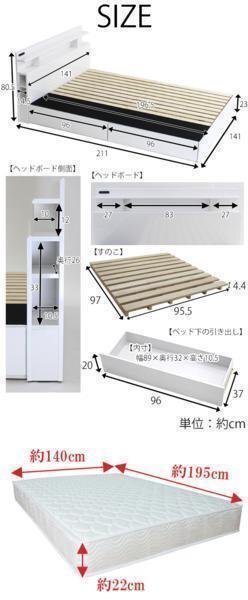 | 商品サイズ | 本体寸法(引き出し付きシステムベッド) : 約(幅)141x約(奥行)211x約(高さ)80.5(cm) 本体寸法(マットレス) : 約140(幅)x約195(奥行き)x約22(高さ)(cm) |