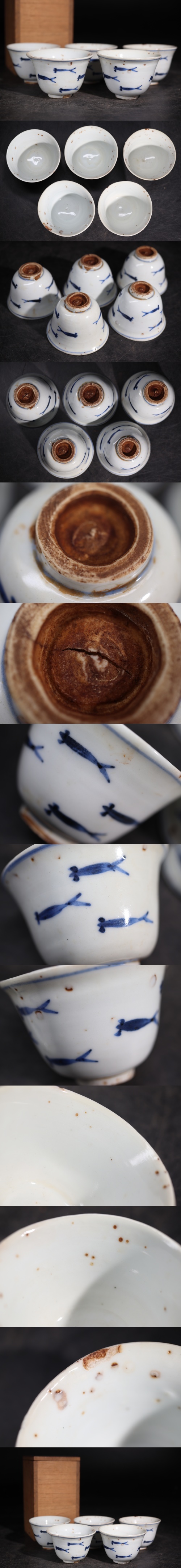 | 時代 染付 メダカ紋 煎茶碗 五客 木箱付 / 茶器 煎茶道具 煎茶飾 検索: 京焼 中国美術 .G3187 |