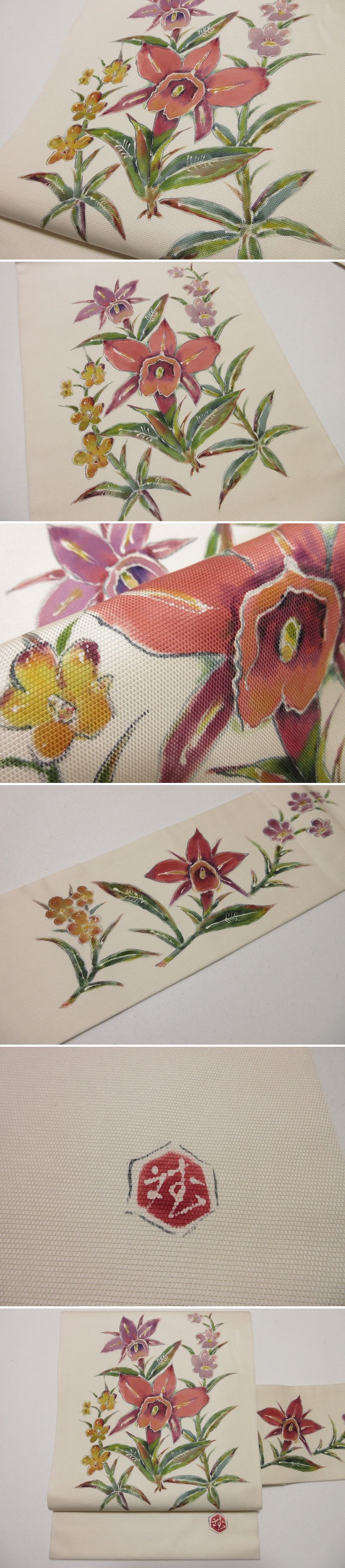 | 商品名 | ドークブア■九寸名古屋帯 作家 手描き 花 象牙色 極上の逸品 A09 |