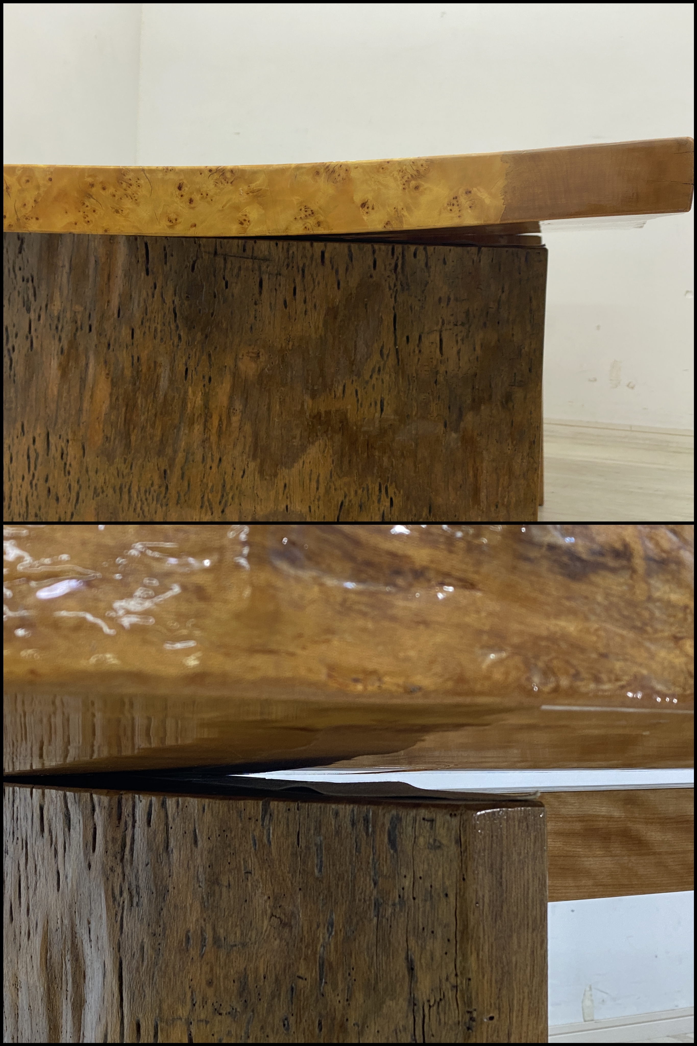特徴としましては、やはり巨大なバーズアイメープルの一枚板。