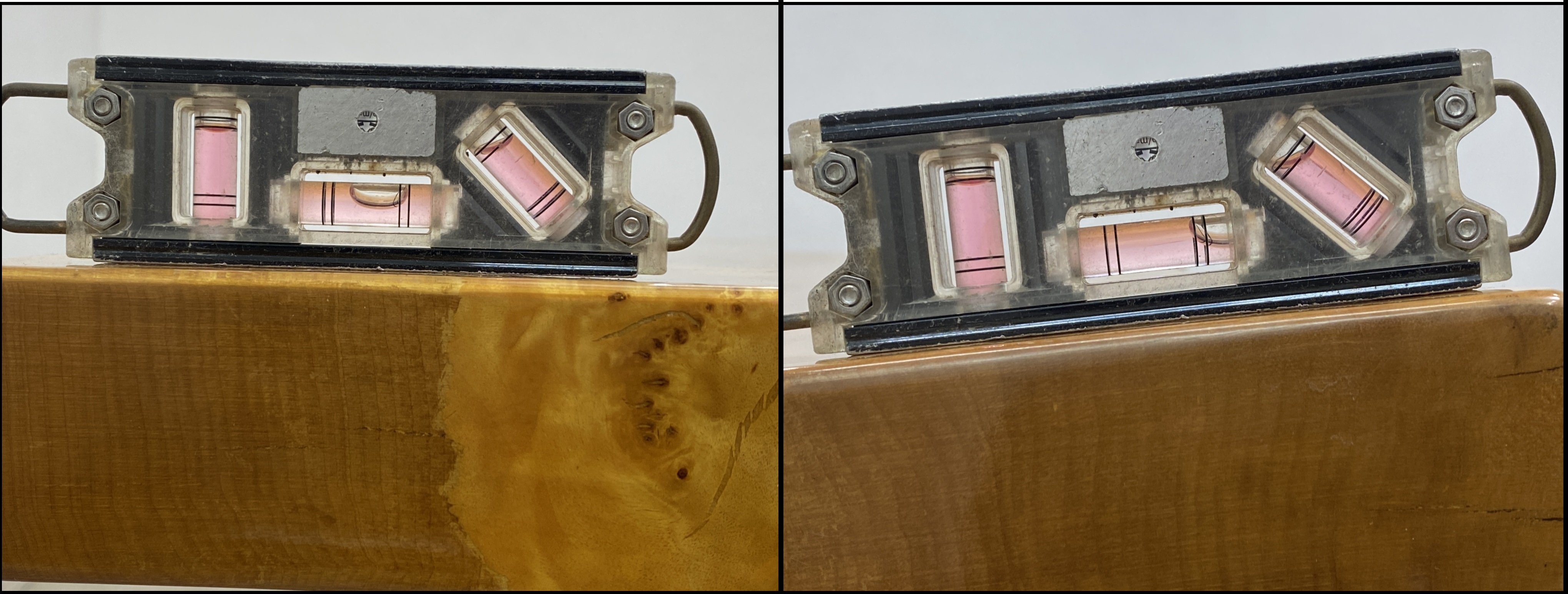 【水平計による測定(左側天板中央部、右側天板端部)】