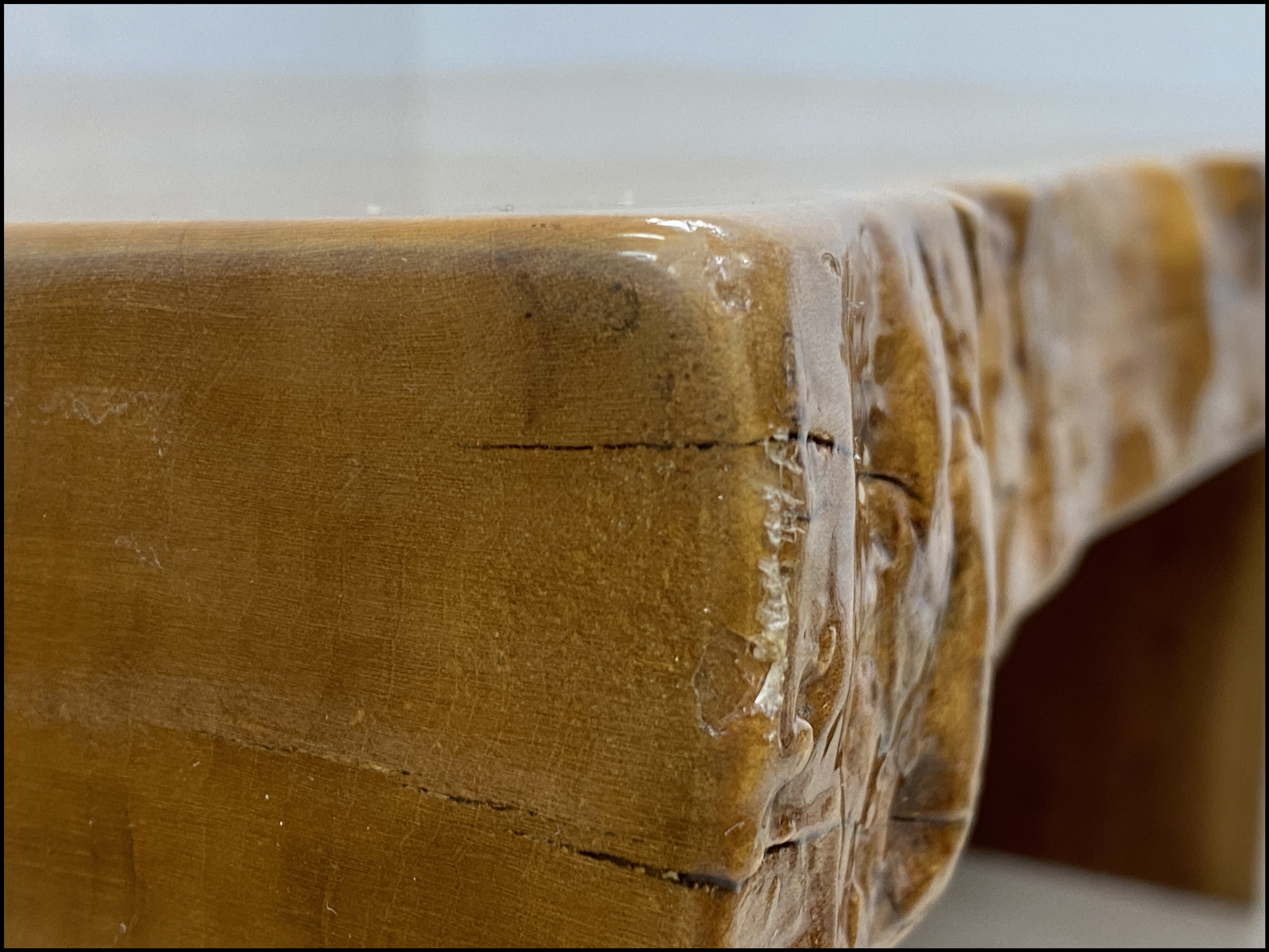 またフチなどに小キズがいくつかあるほか、角に小さなクラックがあり、脚部にはネジ穴らしき痕があります。
