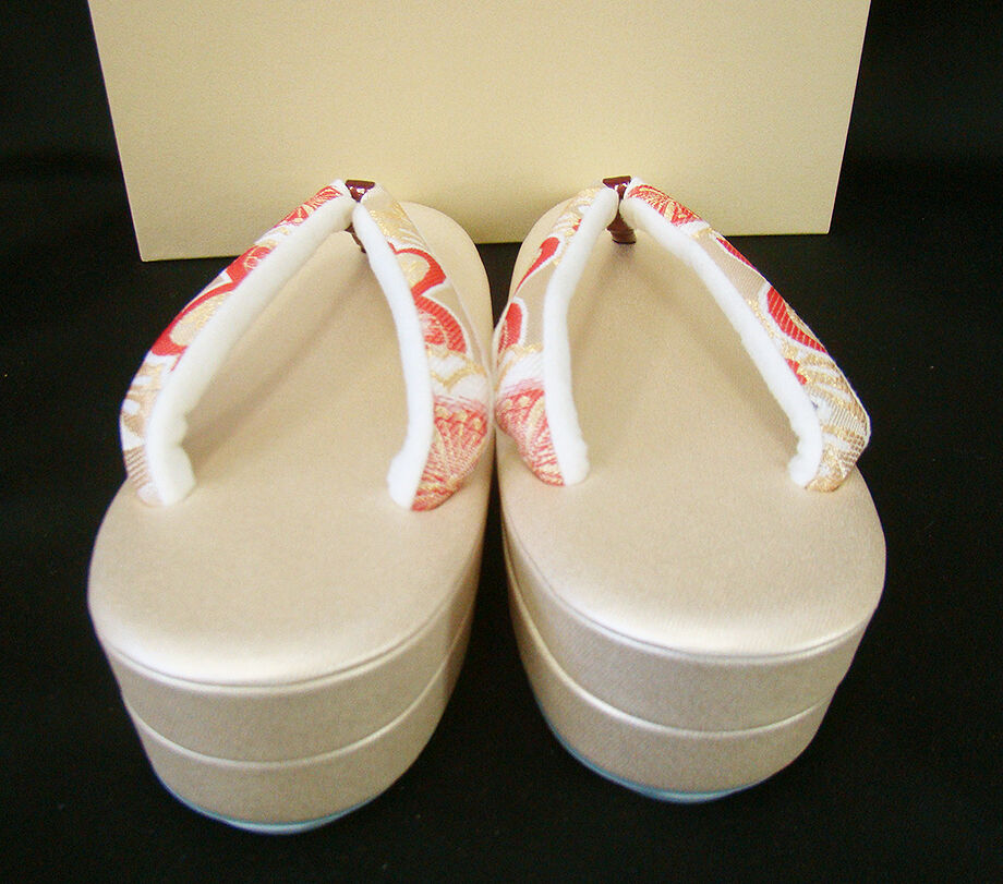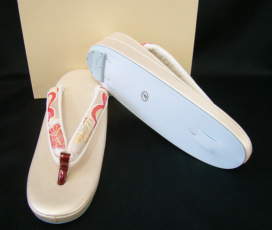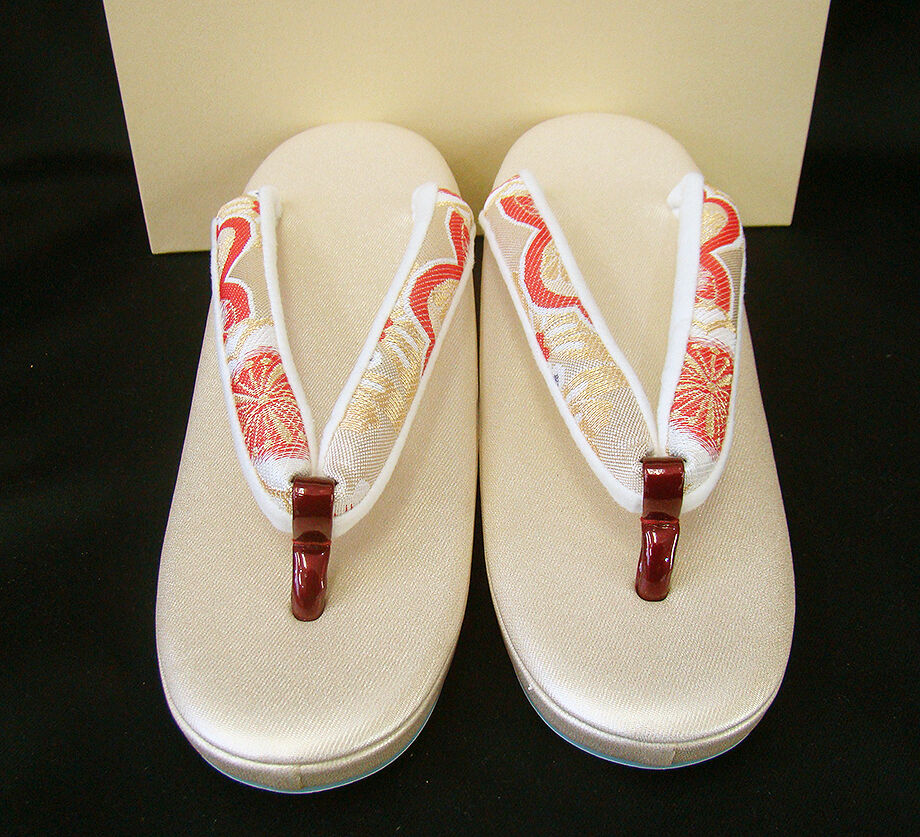 ●日本製 華やかな金色の台地に、ベージュ色地に金糸、赤色等の痛くなりにくい太めの鼻緒。 ●草履寸法24.5cm かかとの高さ5cm 巾8cm ※外観と機能性を極めた日本製の洗練されたお洒落なデザインです。 和の彩りに調和する上品でやさしい表情が魅力の草履です。 訪問着等にピッタリ映える逸品です。 |