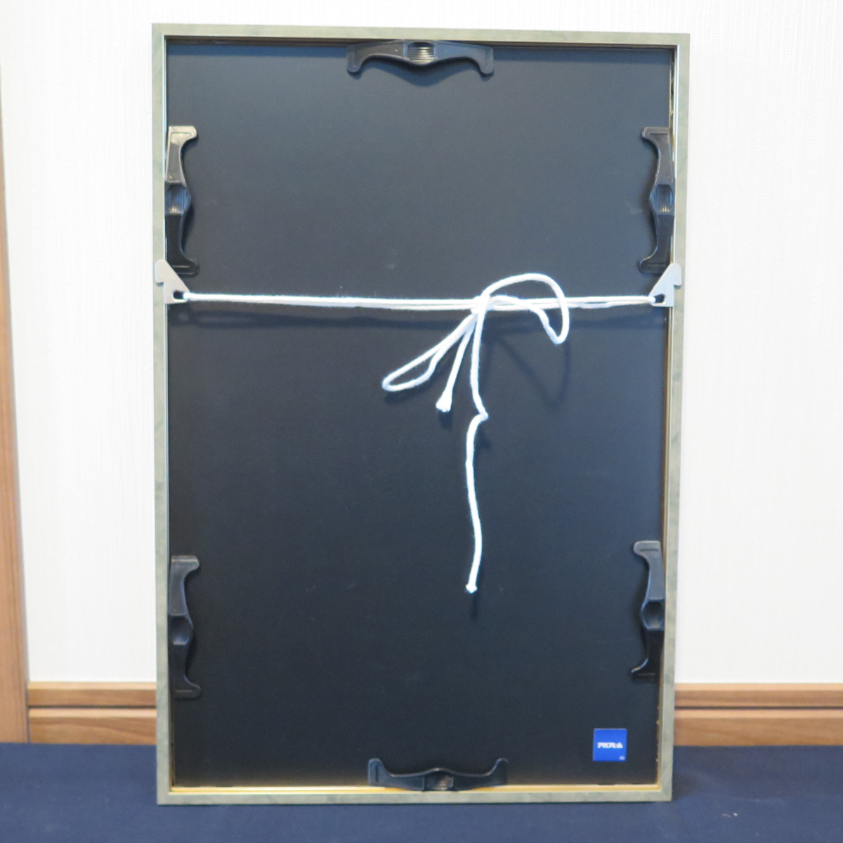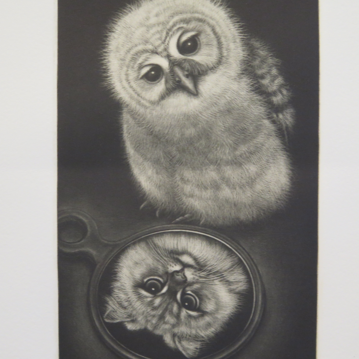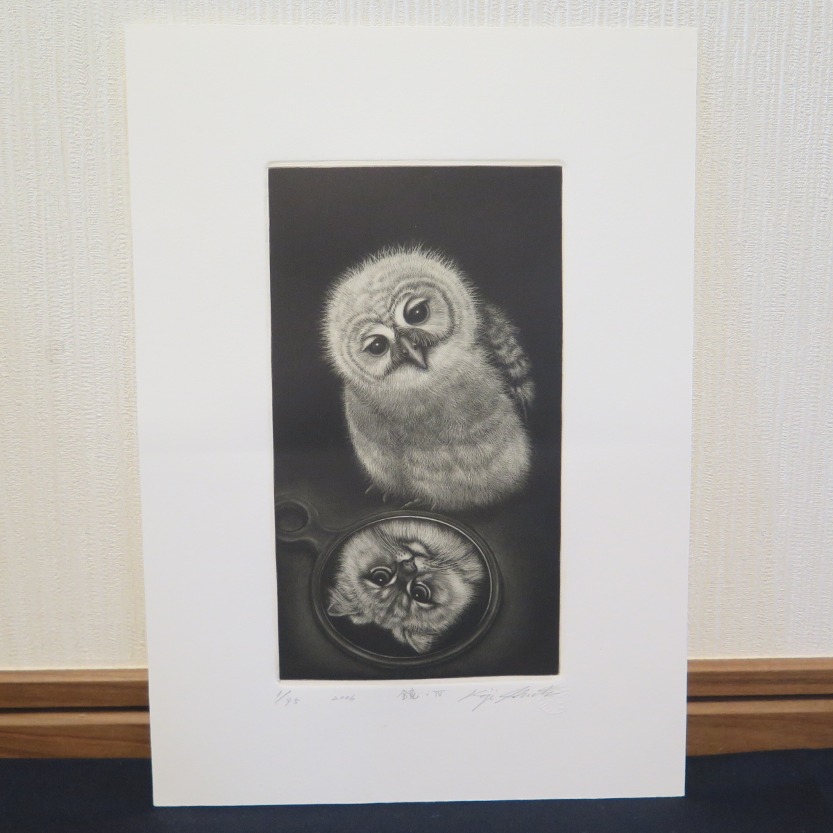 作品は【 鏡・Ⅳ 】フクロウが鏡に映る姿は猫、不思議なムード漂います。エディションナンバーは貴重な№1/95、個展に於いて作家本人からの購入です。メゾチント。画面20.5*11.4㎝(0~1号大)。画面にサイン、エンボス、タイトル、限定エディション1/95、年記2006。シートサイズ31.1*22.1㎝(フルマージン)。シート中央に弱い折れあるも額装状態では目立たず、それ以外の状態は良好です。額装サイズ46.5*31.5*2.3㎝。