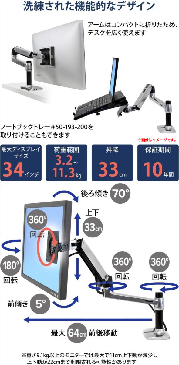 【商品特長】 ◆可動範囲が広い多用途向け万能モニターアームです。 使用しないときはコンパクトに折りたため、作業スペースを広く使えます。 ◆特許取得済みコンスタント・フォース技術により、軽く触れるだけでモニターの位置調節が可能です。 ガススプリング式のような経年劣化がありません。 ◆取扱説明書に従い組み立て、モニターを取り付けてから各部の調整を行ってください。 組み立て前の状態では各部の調整はできません。 ◆昇降機能は10,000回ものサイクルテストが実施されており、 長年に渡りトラブル無く、スムーズに高さ調整が可能です。 | |||||||||||||||||||