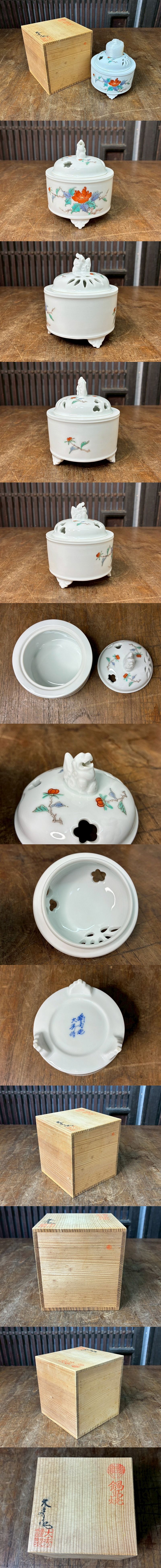 | 未使用 鍋島焼 大秀作 三つ足 香炉 錦牡丹 筒型 色絵花紋 透かし彫り 箱付 高さ11㎝ | |