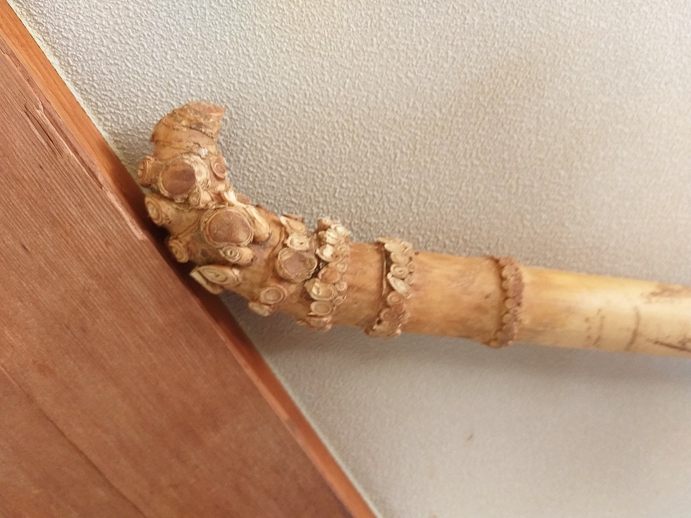 竹材の根部原来の形状と表面の模様を壊さないように、贅沢に、全て手作業により、ペンチ、手術用ナイフ、肥後守、彫刻刀により少しずつ、少しずつ枝根を取り除く作業がなされました。