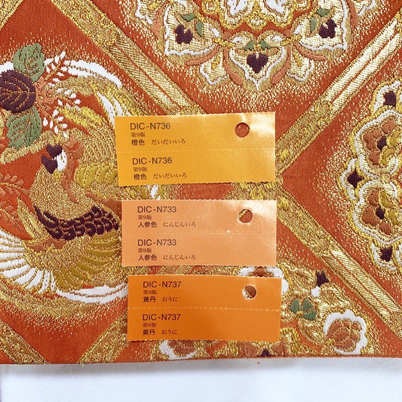 | コメント | オレンジ色の地に金糸をふんだんに用いて花唐草、宝相華、雪輪、鳳凰文などが織り出された華やかな袋帯です。 若干の締め跡などの使用感はございますが、特に目立つようなダメージもなく全体的に美品です。 上質な逸品ですので、いかがでしょうか?よいお品物でお勧めです^^ |