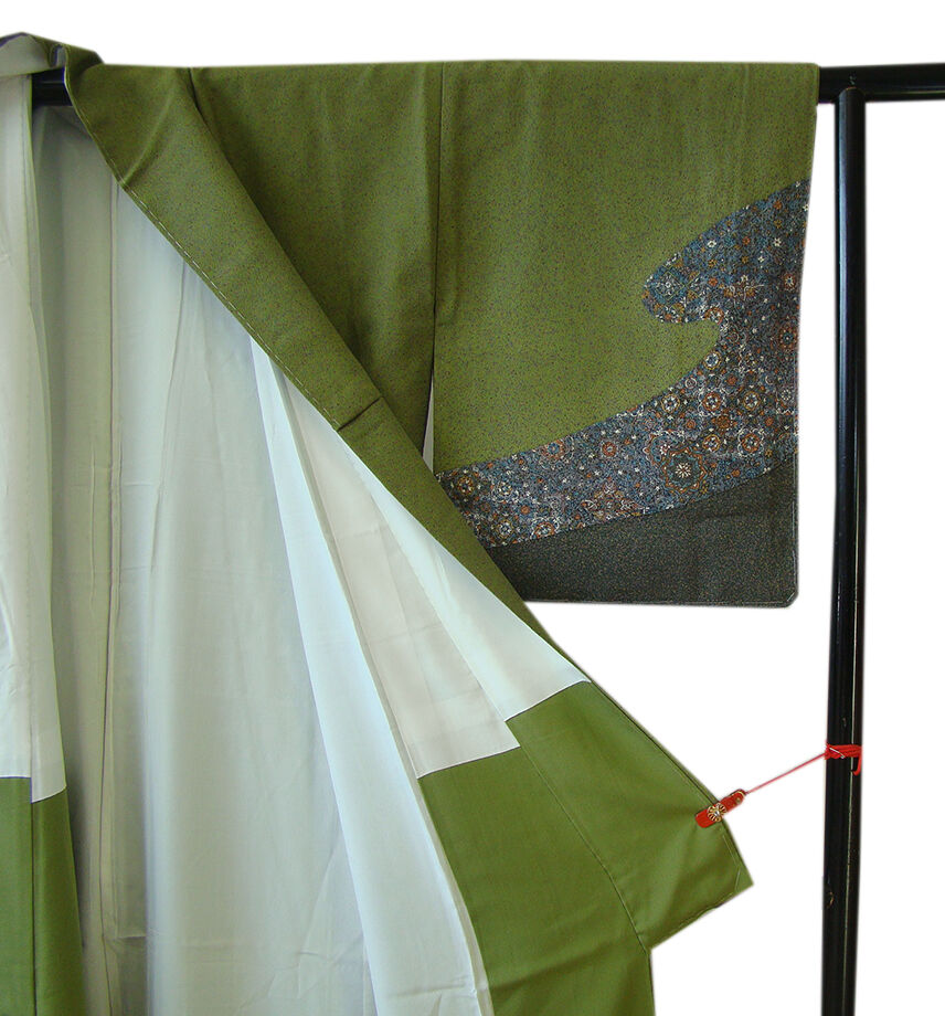 | 商品説明 | こちらのお品は「袷」でございますので、10月~5月までお召頂ければと思います。 しなやかでさらりとした手触りの着心地良いちりめん地の生地、 渋い鶸茶色地にたたき染に裾ぼかし染に華文柄の染柄、 八掛は共色(正絹)、幅広い年代の方にお召頂けます。 |