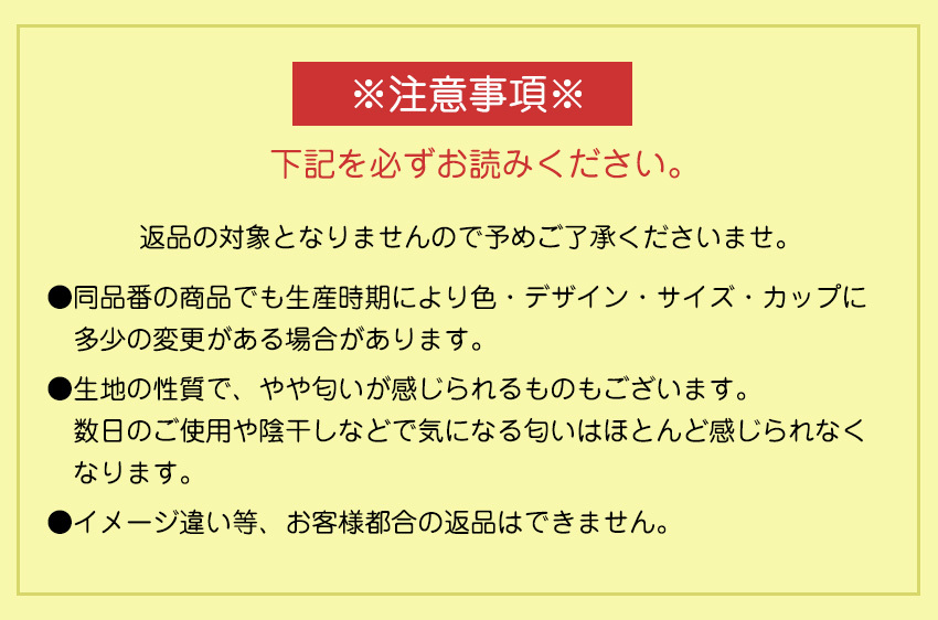 ・同品番の商品でも生産時期により色、デザイン。サイズ、カップに多少の変更がある場合がございます。