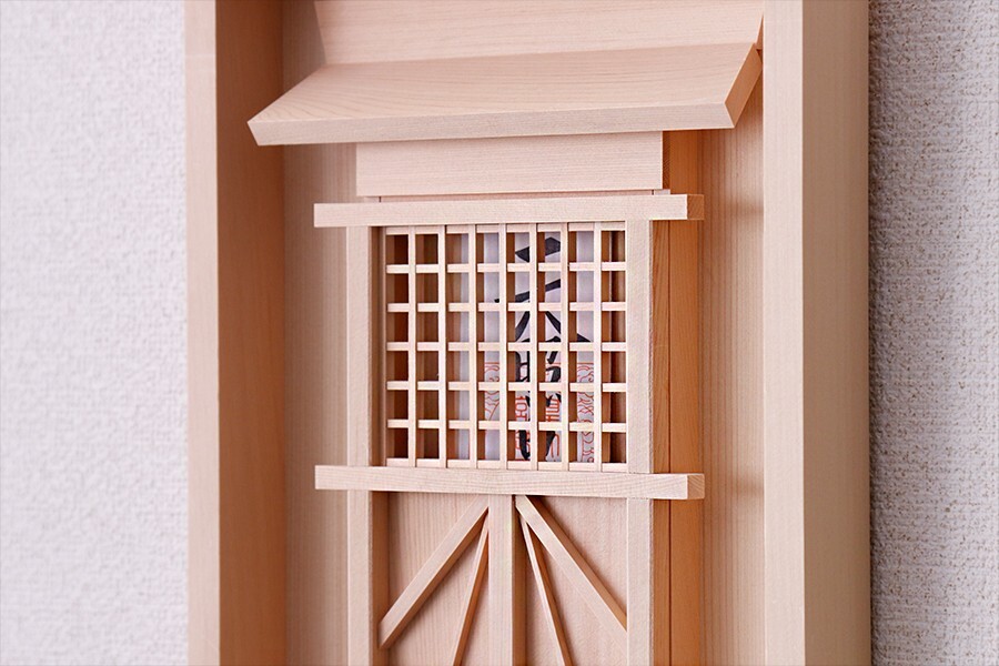 壁に掛け、絵を飾るようにお祀りできる美しい簡易神棚。格子の扉の向こうに「天照大御神」を安置します。省スペースで薄く、お部屋の雰囲気を損なわない外観。モダン神棚の中でも最もシンプルにお祀りしたいシーンに。コンパクトでも本体の素材は木曽桧(尾州桧)を使った、伝統を重んじる造り。様々な壁面に簡単に取り付けられる手軽さも魅力。高さ28センチまでのお神札を収納できます。 取り付け方 壁の状態に対応するためピン釘が2種類と、取付け専用パーツが付属します。石膏ボード壁、合板壁、柱や鴨居などに設置できます。取り外しても跡は目立ちにくく、賃貸のお住まいにもお勧め。届いてすぐに御札をお祀りできます。 | |||