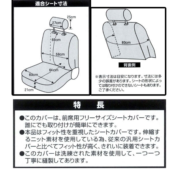 ●主な特長● ☆車内をかわいく彩る カラードカバー☆ ◆フィット性を重視したシートカバーです。 ◆伸縮するニット素材を使用している為、従来のシートカバーと比べてフィット性が高く、きれいに装着出来ます。 ●商品詳細● ◇メーカー:大垣産業 BOMFORM ◇品質:表地/ポリエステル100% ◇サイズ:フロントバケットシート汎用シートカバー2枚セット