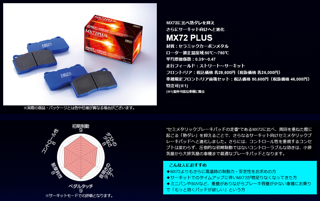 | ■ブレーキパッドについて | ブレーキパッドはSSM PLUS / SR01 / MX72 / MX72 PLUSのいずれかからご選択頂き、ご注文時に備考欄にてご指定ください。 |