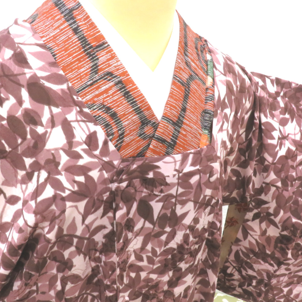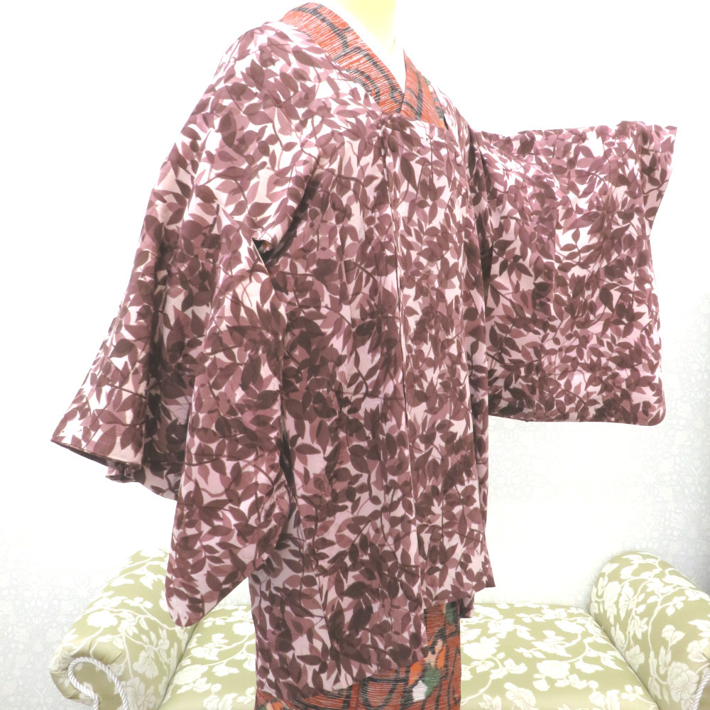 | 道行 アンティーク 昔道行 正絹 ピンク紫 紫 葉文様 レトロ 明治・大正ロマン モダン 和洋ミックス ちりよけ 防寒 汚れ防止 身丈81.2cm |