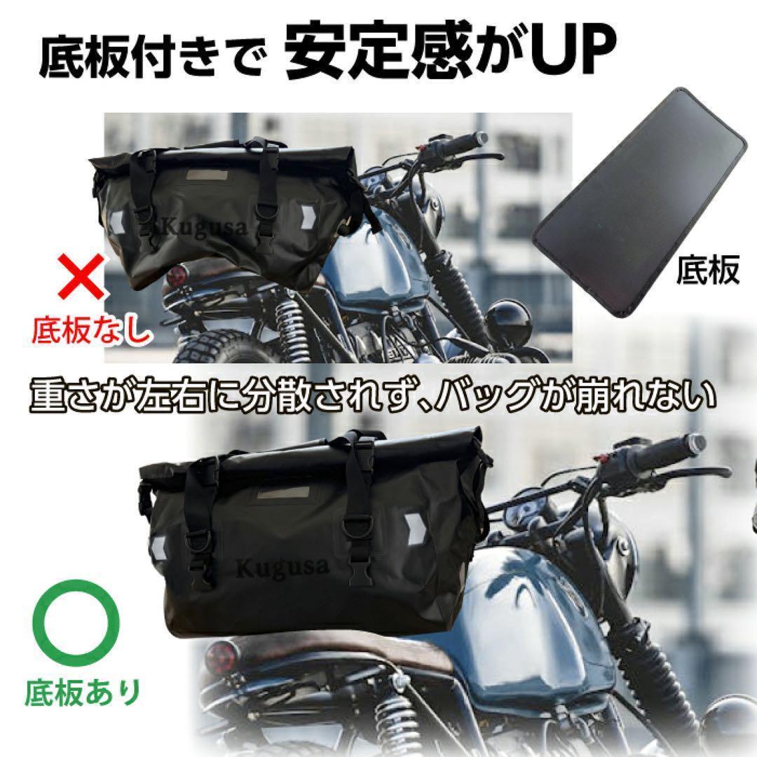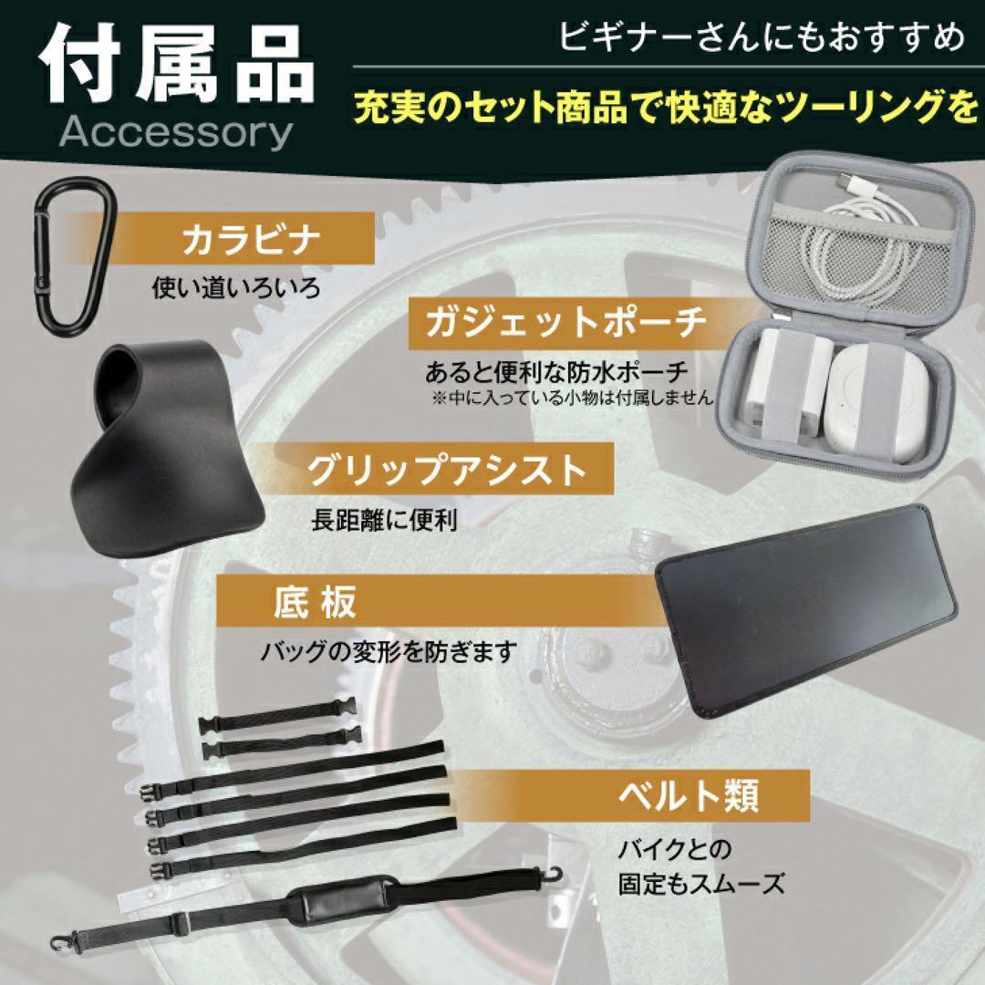 バッグ本体とバイクをしっかり固定する4本のベルト、他のバッグを追加して固定できる接続ベルト、ショルダーベルトはもちろんのこと、ビギナーの方にもおすすめの付属品です。特に底板はバッグの変形や崩れを防ぎ、荷物の安定性を向上させます。