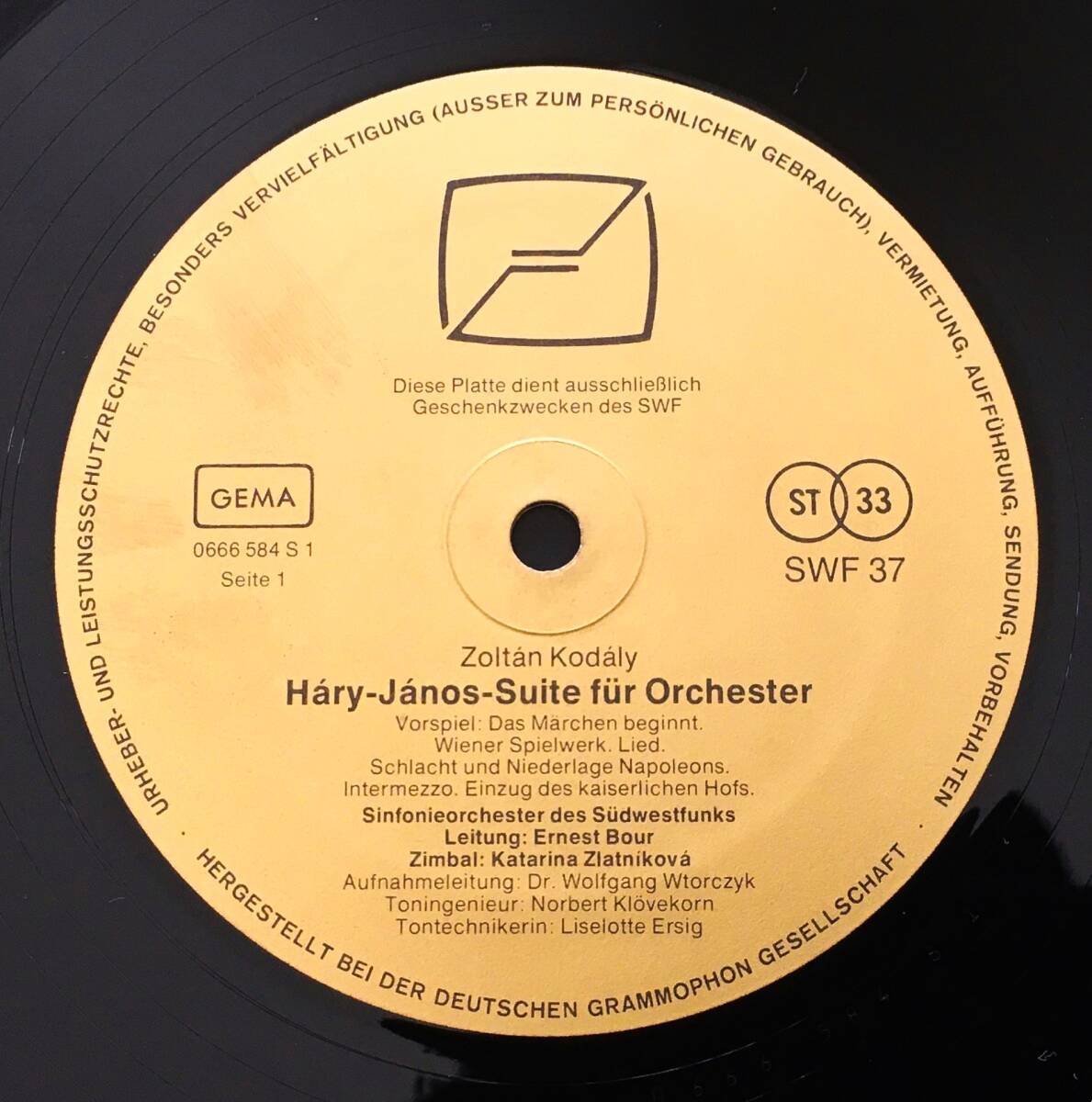 レコードのA面にはエルネスト・ブール指揮南西ドイツ放送交響楽団によるコダーイの組曲「ハーリ・ヤノーシュ」が、B面にはディータード・ヘルマン指揮南西マインツ・バッハ管弦楽団、マインツ・バッハ合唱団によるバッハのカンタータ第39番「飢えたる者に汝のパンを与えよ」が収められています。