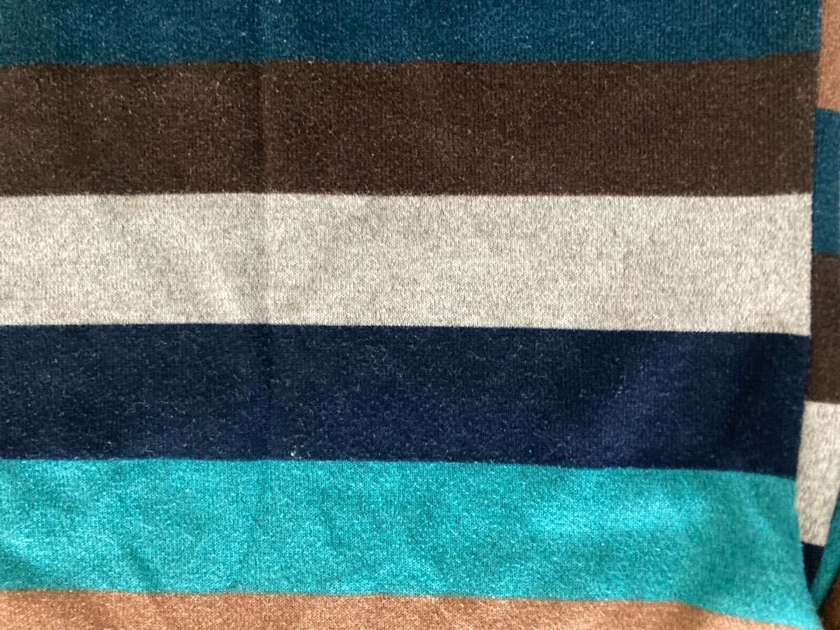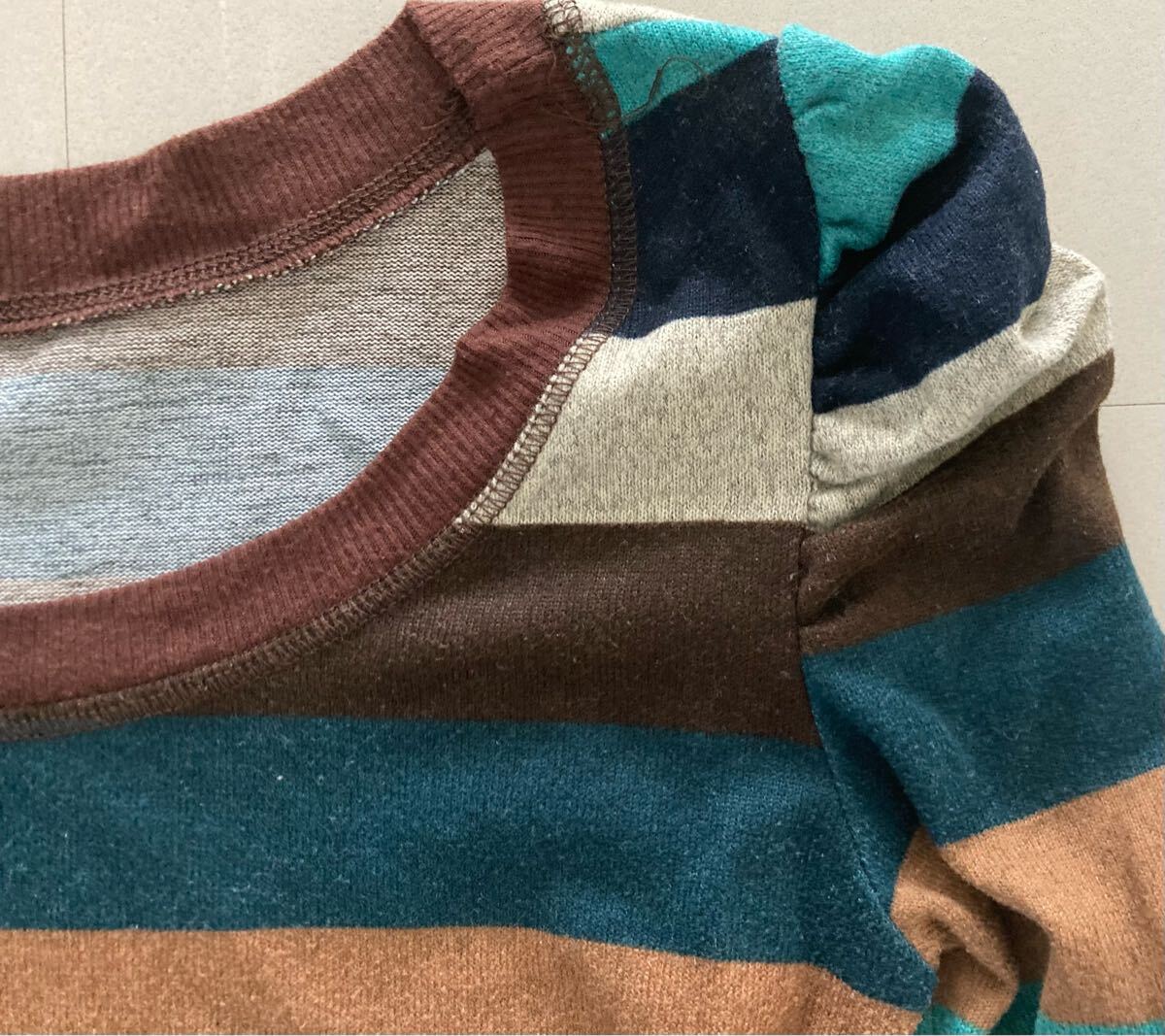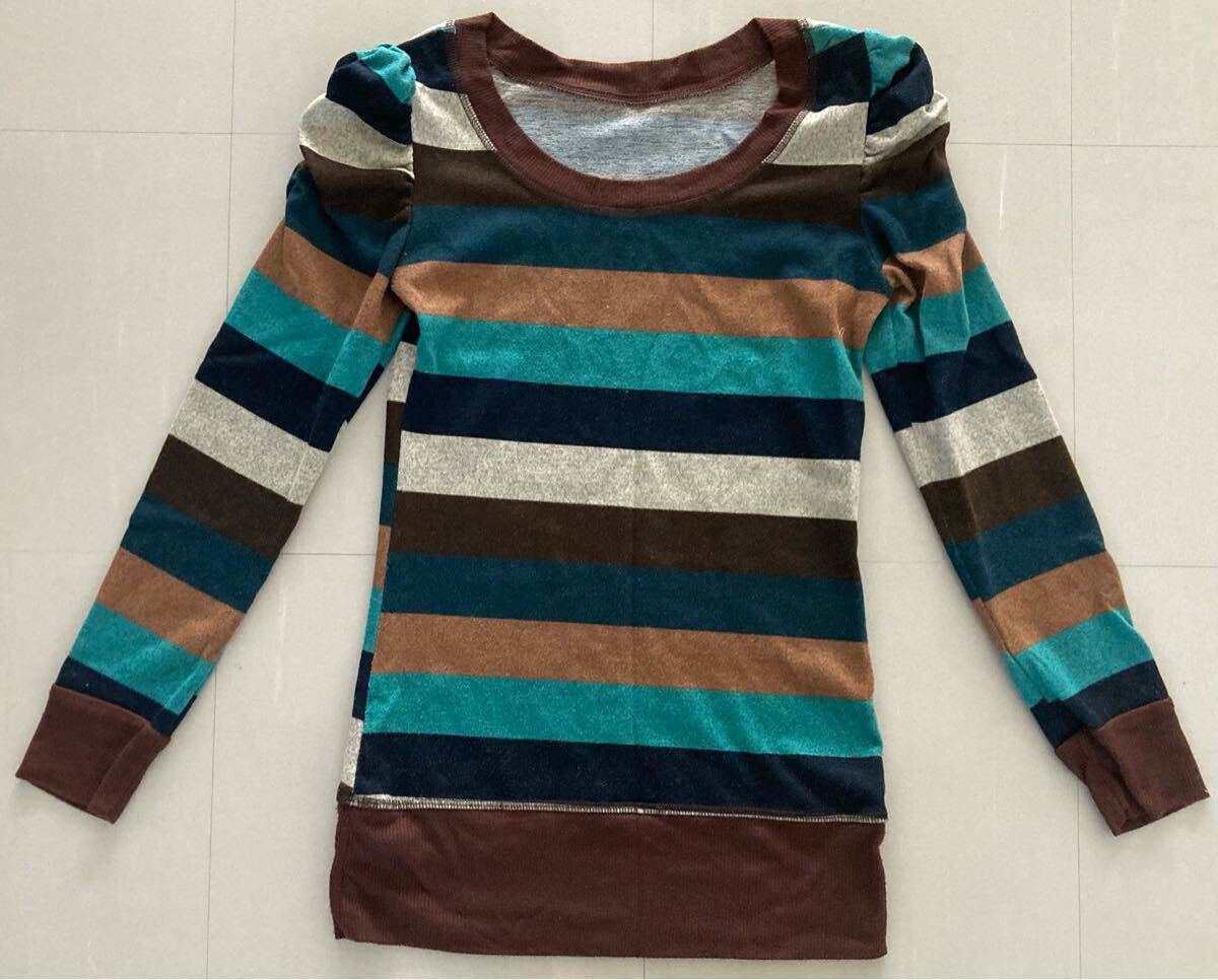 サイズ表示がありませんが、S位で体にフィットする感じです。袖の膨らみが可愛いデザインで、着丈約65cm、身幅約35cm、首周りが少し大きいのでキャミなど紐見せのスタイルで着ていました。