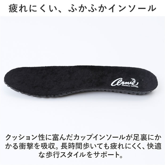 | 注意点 | ※※【About Arnie Arnold Palmer】 ※日常をより便利に快適に、みんながハッピーな毎日を過ごせるように。「Arnie Arnold Palmer」は、60年以上の歴史を誇るファミリーブランドとして有名な「アーノルド・パーマー」のレディースライン。 ※※1.シューズ片足分の重量はわずか約255g。履いていることを忘れてしまうほどの軽い履き心地で、軽快なフットワークを実現・・・(※24.5cmサイズの商品、付属のインソールの重量を含む、片足分の計測重量です。) ※長時間日光にあたったり、摩擦、水漏れなどによる色落ちや色移りすることがあります。 ※お取り扱いの際は、商品やパッケージなどに記載されている品質表示、アテンションタグ、ご使用上の注意事項などを必ずご確認下さい。 ※本来の目的以外にはご使用にならないで下さい。 ※カメラやモニターの性質により、画像と実物の色の違いがある場合がございますのでご理解願います。 |