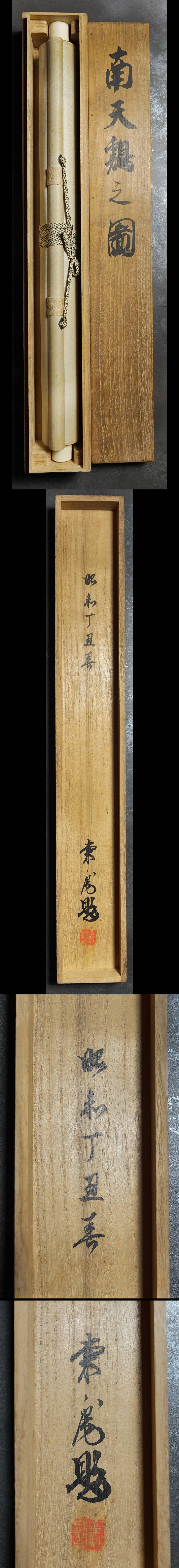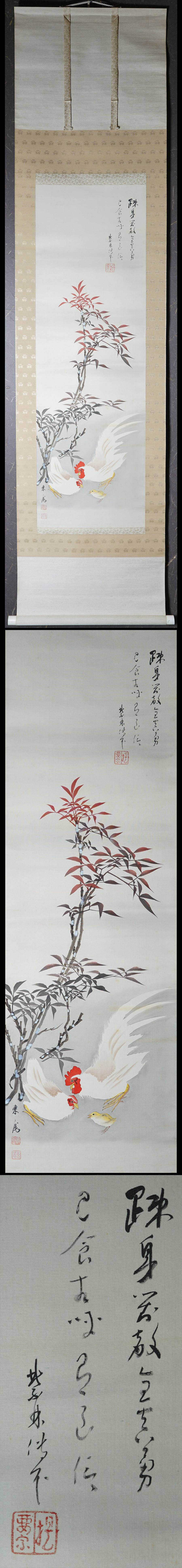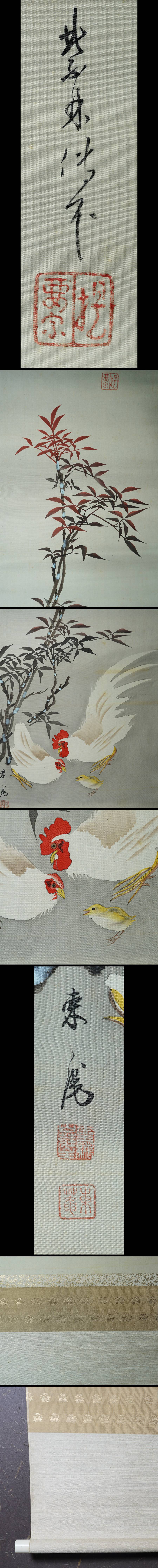 【サイズ】:表具が縦 202cm、横 49.5cm 本紙が縦 113cm、横 36cm 【本紙】:絹本。 【 箱 】:平井東庵の共箱あり。 【状態】:良好。 南天に鶏は伊藤若冲のもの有名です。 鶏は子孫繁栄、南天は難を転じる。縁起物です。 |
