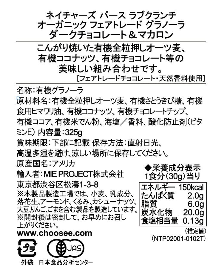 ・ 325グラム (x 1) 77198・・FlavorName:Dark Chocolate MacaroonSize:325グラム (x 1)・内容量:325g・原材料:有機押しオート麦、有機さとうきび糖、有機食用ひまわり油、有機ココナッツ、有機チョレートチップ、有機ココア、有機米澱粉、塩、香料、酸化防止剤(ビタミンE)・商品サイズ(高さx奥行x幅):240mmx320mmx150mm・ブラント名: ネイチャーズ パース・メーカー名: ネイチャーズ パース商品紹介 こんがり焼いた有機オート麦とチョコレート、ココナッツの定番人気の美味しい組み合わせです。朝食として、またお手軽に持ち運びいただけるスナックとして最適です。 ネイチャーズ パースはアメリカNo.1のオーガニックシリアルブランドです。厳選したオーガニック食材を利用して、健康的で、最高に美味しいオーガニックシリアルやグラノーラを作っています。 ネイチャーズパース社は、人々のより良い生活と地球の美しい姿が守られ、そして継続していくことを常に望んでいます。持続可能な方法で作った美味しく、その上オーガニックで健康的な自社商品が成長し続けているということが、同社の情熱のよりどころです。このような思いがファミリーカンパニーであるネイチャーズパース社の会社の基礎理念となっております。・原材料・成分 有機押しオート麦、有機さとうきび糖、有機食用ひまわり油、有機ココナッツ、有機チョレートチップ、有機ココア、有機米澱粉、塩、香料、酸化防止剤(ビタミンE) 本製品製造工場では、小麦、乳、落花生、くるみ、カシューナッツを含む製品を製造しています。| お取引きについて【必ずご確認下さい】 | ||||||||||||||||||||