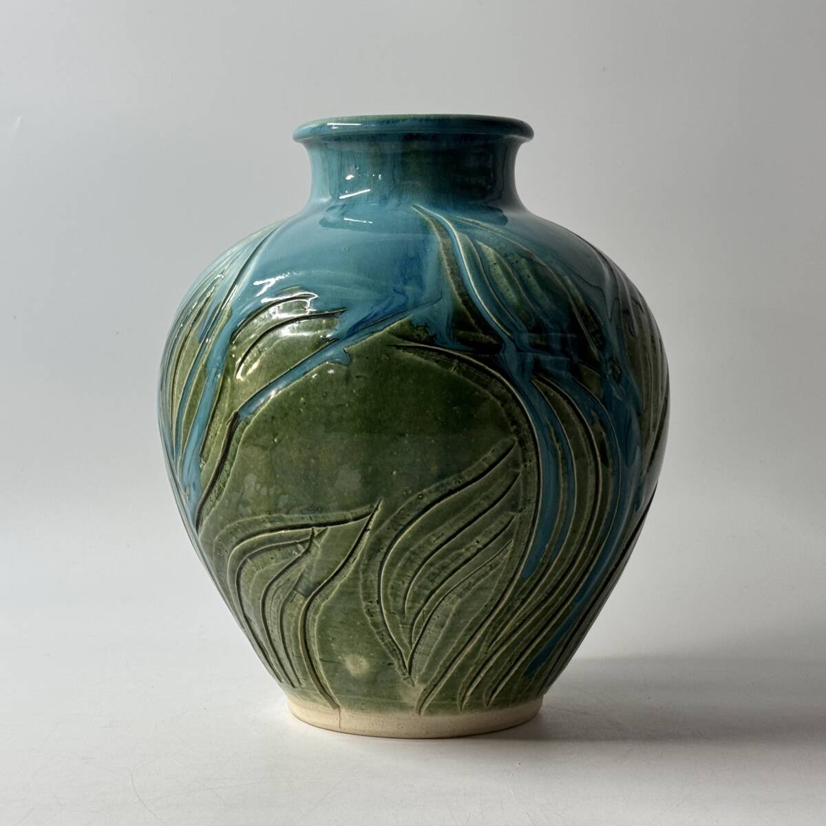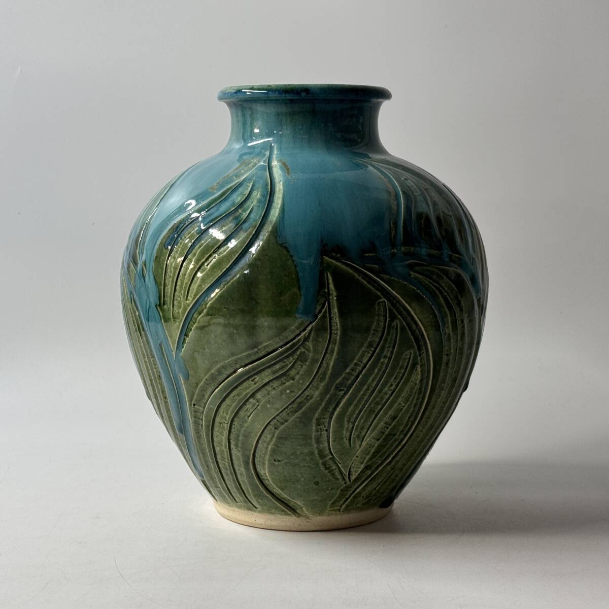 瀬戸焼 一里塚 瀬戸本業窯 水野義郎作 青釉 花壺 花器 花瓶 花入 花生 華道具 茶道具 共箱 栞 経年保管品 現状品の出品です。