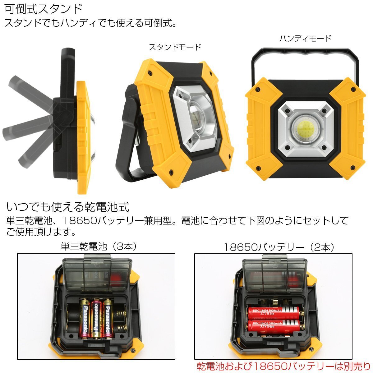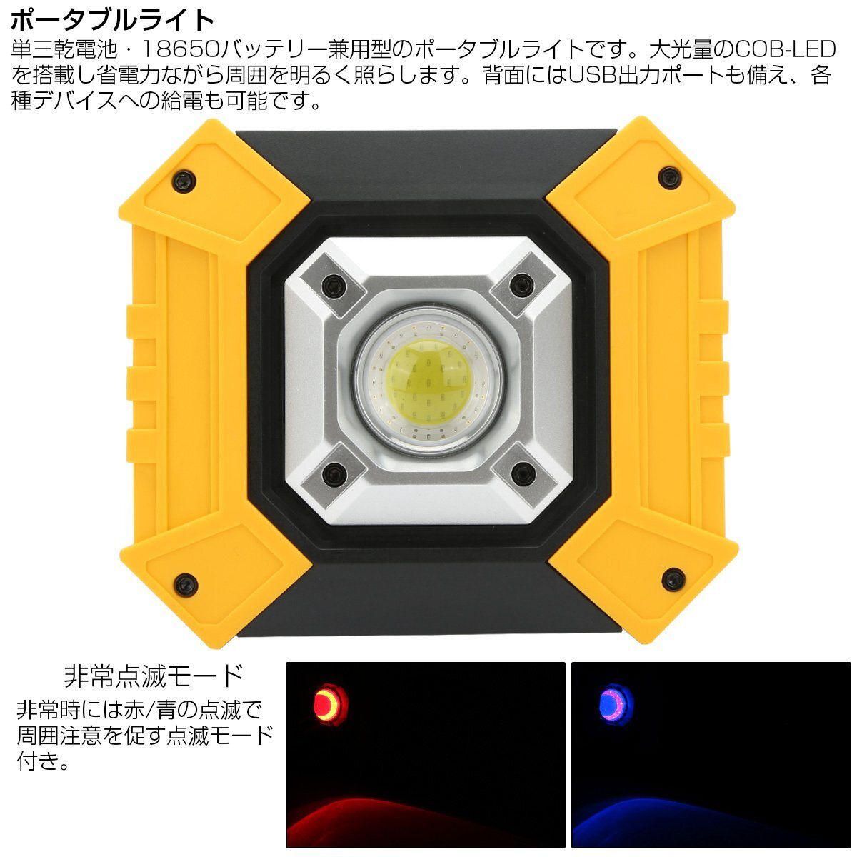 単三乾電池・18650バッテリー兼用型のポータブルライトです。 大光量のCOB-LEDを搭載し省電力ながら周囲を明るく照らします。 背面にはUSB出力ポートも備え、各種デバイスへの給電も可能です。 ※単三乾電池・18650バッテリーは別売りです。 | ■ 10W LED ポータブルライト ■ 単三乾電池(3本)/18650バッテリー(2本)兼用 ■ USB出力ポート×1 ■ 付属品:40cmマイクロUSBケーブル ■ 入数:数量1で1セット 他のランプ関係は⇒ こちら | |
