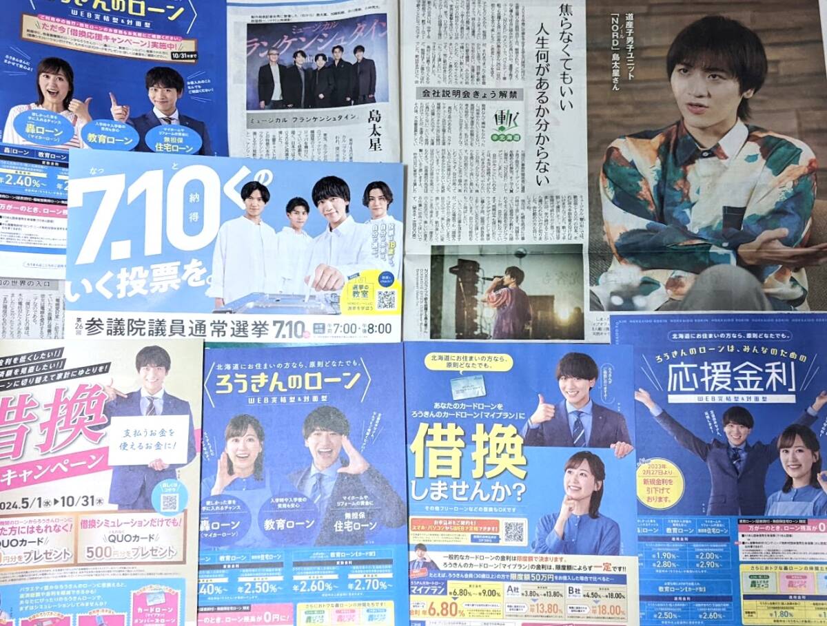 NORD 島太星さんの記事掲載の北海道新聞などの印刷物いろいろです。どうでしょう? ・2024年3月1日付の北海道新聞に掲載された記事(写真参照) ・NORDとしての参議院議員通常選挙のチラシ ・島太星さんが広告モデルを務める「ろうきん」のチラシ各種 |