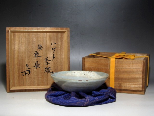 刷毛目茶碗「夜長」です。 時代を感じる見事な出来栄えの貴重な作品です。 箱蓋裏に表千家十二代惺斎の花押のある名品です。 サイズ 直径14cm/高さ5cm(多少の誤差はお許しください) 状態 一見して疵やヒビ・直しは見られません。 骨董品という事をご勘案頂き、時代経過のスレや、小さな傷がある場合があるかもしれませんのでご承知置きください。 | |||