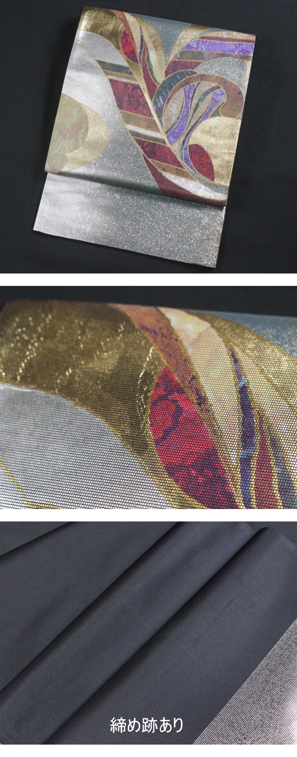 オパールのような、神秘的な輝きを宿した素材「螺鈿」。 自然の宝石とも呼べるその螺鈿を用いて創作された、美しい一条をご紹介します。 銀地を基調に、金彩と多彩な色箔、さらに螺鈿の虹色の光沢を巧みに組み合わせ、華やかでありながら品格ある意匠に仕上げられています。流れるような曲線を描くモダンな文様は、まるでアール・ヌーヴォーの装飾芸術を思わせる優美な構成で、角度によって表情を変える螺鈿の煌めきが装いに奥行きを添えます。 「織り螺鈿」とは、漆工芸に用いられる螺鈿細工を織物に応用した高度な技法で、極薄に加工した貝片を織りの段階で織り込み、柔らかな風合いの中に虹色の輝きを宿します。熟練の技を要するため、希少性の高い高級帯として知られています。 格調と華やぎを兼ね備え、晴れの日の装いをいっそう印象的に引き立てます。 光を纏うような美しさを、どうぞご堪能くださいませ。 ※撮影時の部屋の照明によって画像の色に若干の差がございます。色味に差がございますことをご了承のうえご検討下さいませ。 …状態… 締め跡。小さな傷跡あり。 ※全くの新品ではございませんので、記載のない変色やスレ、ヤケ、その他僅かな難がある場合がございます。そのような理由でのキャンセルはお受けできませんので、ご了承の上ご検討お願いいたします。 |