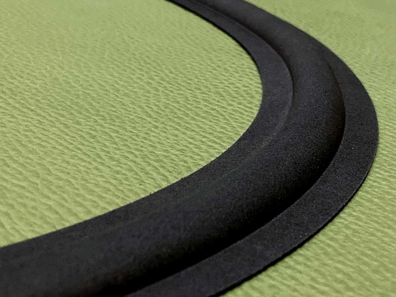 素材には「ウルトラスエード」や「アルカンターラ」の名で知られる「東レ・エクセーヌ」を使用しております。軽量で柔らく、適度な反発力と復元性があり、音響特性に大変優れた革新的な素材となっております。自社にて熱成形プレス機で加工、製品化をしております。 小音量時にも入力信号にたいして機敏に反応するエッジで、低音の解像度が良く、動作は温度変化に影響されません。また、劣化がないためエッジの寿命は半永久的となります。 現在に至ってウレタンエッジが音響特性上最も優れているとされておりますが、経年劣化での音質の変化、加水分解で剛性を失い、朽ちるという問題があります。また、業務用スピーカーに多用されているクロス素材のエッジ(繊維を織った布)は耐久性はあるものの、形を保たせるための固着剤を要するため、他の素材と比較して固いものも多く、経年で更に硬化することがあります。柔らかめに作られているものは反発(復帰力)が十分でなく、振幅制御にスピーディーに反応しません。 人工皮革エッジは《高音質、高耐久性》、安心して末永くご使用できるエッジです。